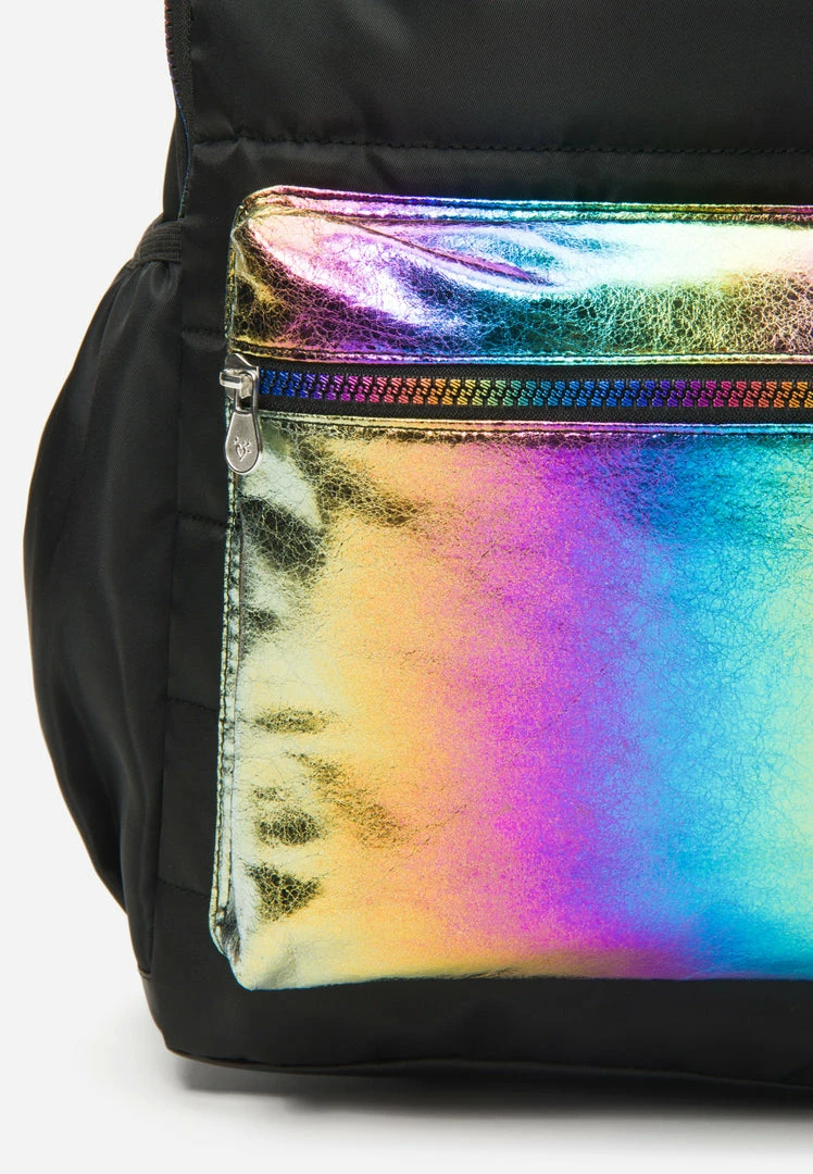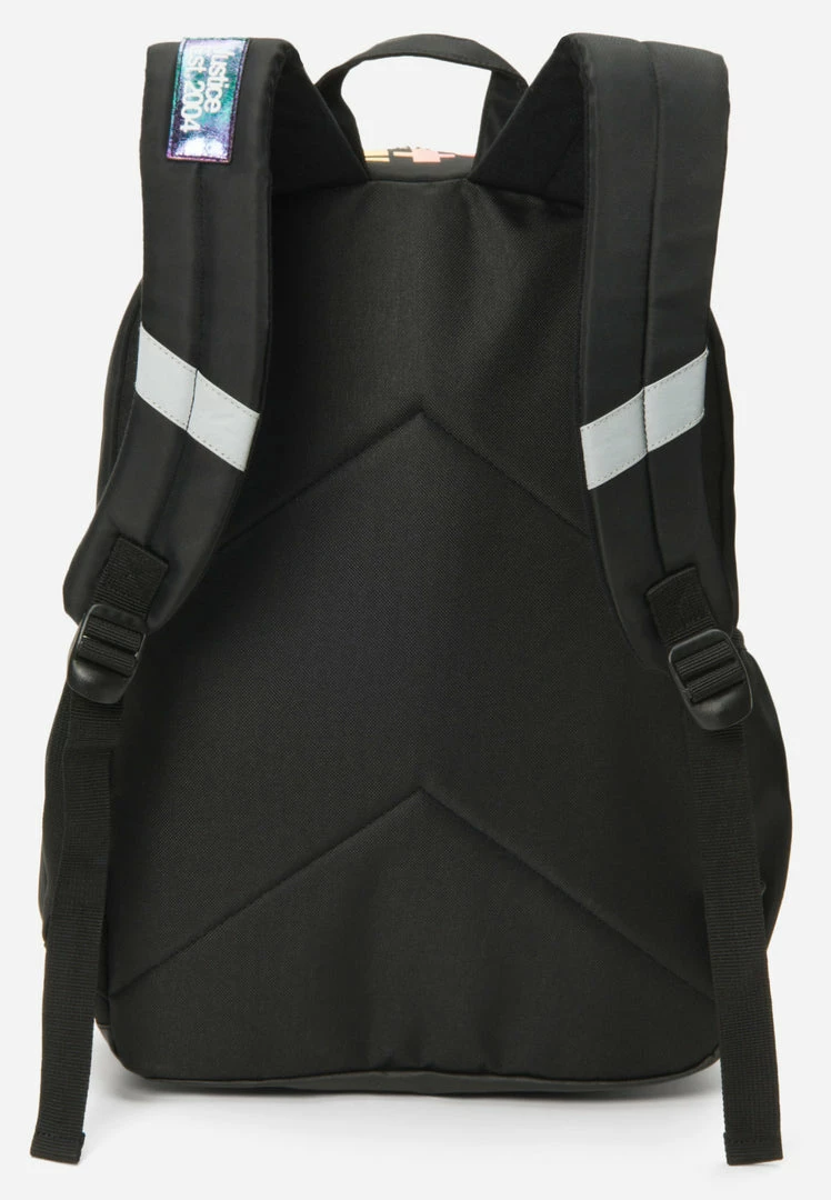 Our girls’ backpacks are super-spacious and just right for your on-the-go girl. A front, color-block zipper pocket keeps smaller, more important essentials organized. Two side pockets are perfect for tucking away water bottles and other beverages. The larger zipper panel secures other items and has a padded interior sleeve that protects her electronic devices. The top handle and cushioned, color-block straps offer comfy, hands-free carrying. A Justice logo design adorns the top. And glimmering patches–stationed on the front and one of the straps—bring a fun element. Plus, the quilted design and shimmery rainbow finish give her standout style—especially when you’re trying to spot her in the after-school crowd.