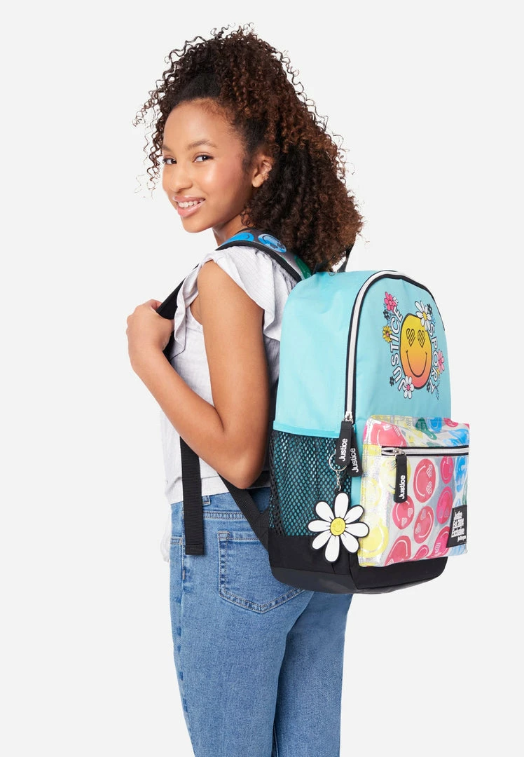 Even your girls’ books deserve to go to school in style, so we designed our girls’ J Sport backpack in a colorful graphic with plenty of space for her school essentials and her practice gear–– including a secure interior slip pocket for her laptop. This vibrant carryall has a secure double-zip closure and features a sparkling metallic front zip pocket with graphics, side pocket, water bottle pocket, padded adjustable straps, and a comfortable cushioned back. And the smiling daisy keychain makes it easy to keep her keys in sight.