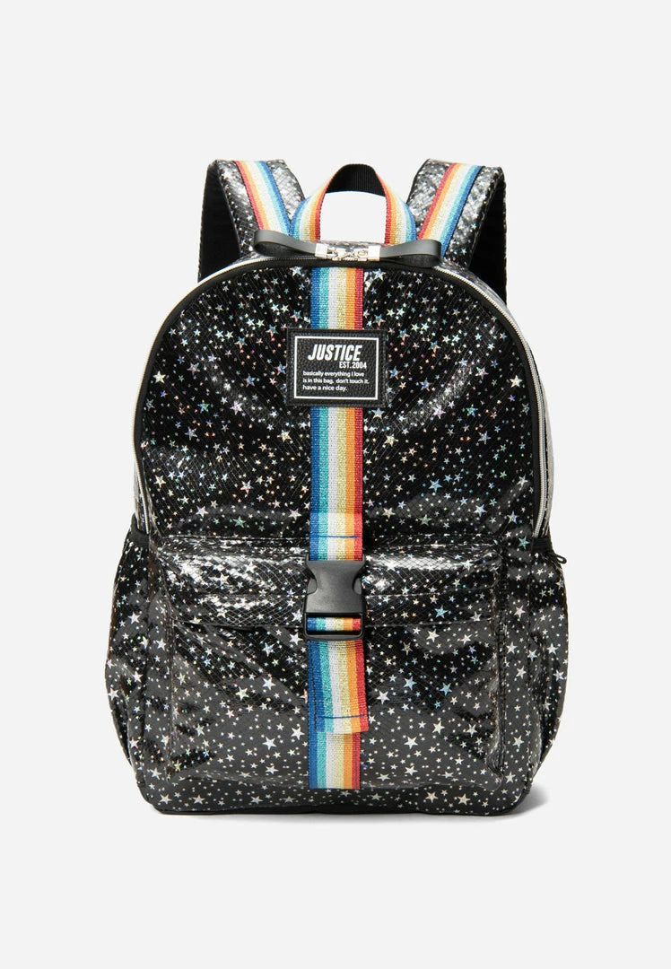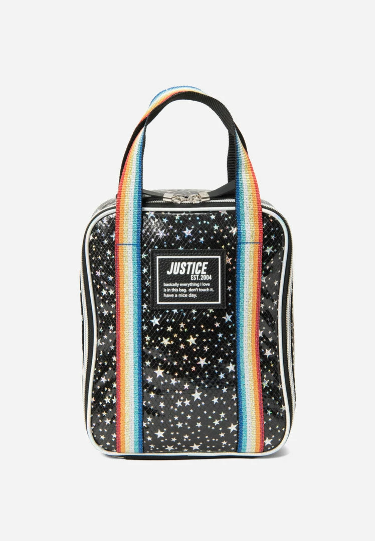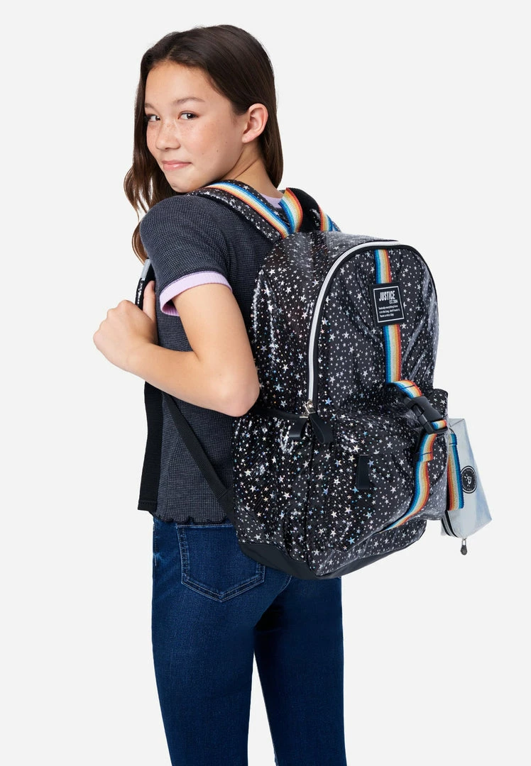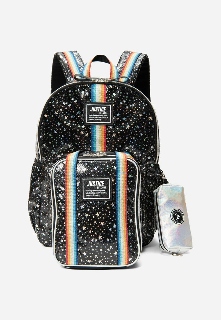 When your girl steps into the classroom carrying our girls’ iridescent star patterned backpack set with colorful stripes, all eyes will be on her. This spacious backpack has plenty of space for her school essentials–– including a secure interior slip pocket for her laptop. It also has a secure double-zip closure, and features a front zip pocket, side pocket, water bottle pocket, padded adjustable straps, and a comfortable cushioned back. And just in case your girl wants to say less, there’s a bold graphic print at the back that matches the unique embroidered patches at the front to let everyone know that this bag is hers. In addition, this set includes a star patterned lunch tote with top handles and zip-around closure that easily detaches from the front. Finally, the iridescent compact zip pouch is large enough for her classroom necessities such as pens, pencils, and a calculator to amp up the storage. It effortlessly fits into the backpack’s side pocket, or she can carry it alone thanks to the detachable wrist strap.