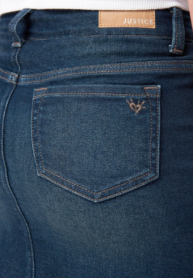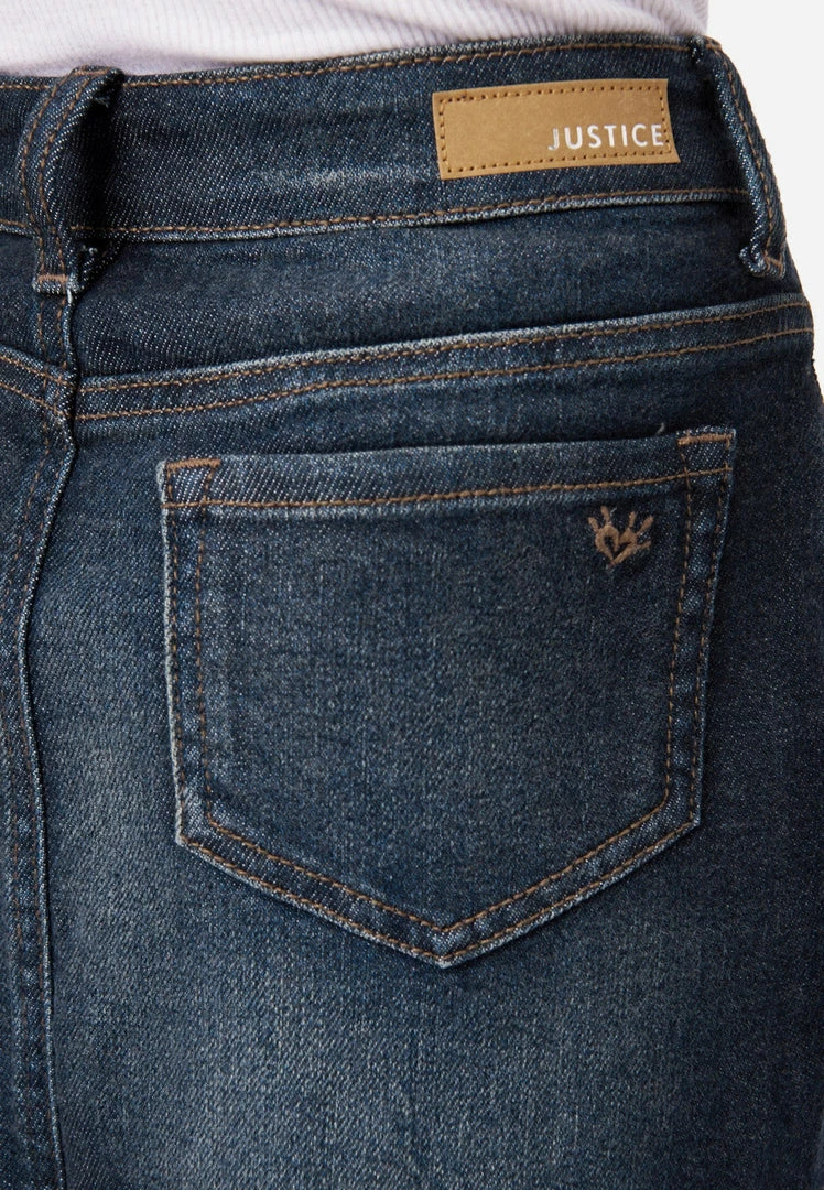 Your girls’ style will never go wrong with a denim skirt, so we designed this one with a dark wash to give her style versatility. We made it with stretchy denim that allows her to move with ease. Distressing gives it a vintage feel. It has a classic mid-rise, belt loops, and slip pockets. And the frayed hemline highlights the mini cut. Pair it with one of our lace-trim camis or graphic tees to complete the look.