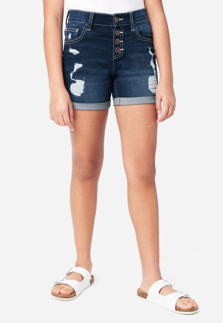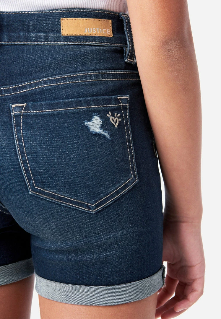 Our girls’ denim shorts have a classic 5-pocket design, cuffed hems, and a close fit. We updated them with a high-rise and midi length for extra coverage. The wash makes them a versatile pairing for her tanks and tees. Distressing gives them a lived-in vibe. Plus, the cotton-blend fabric has a hint of stretch that promises this pair will keep up with all her leaps and strides.