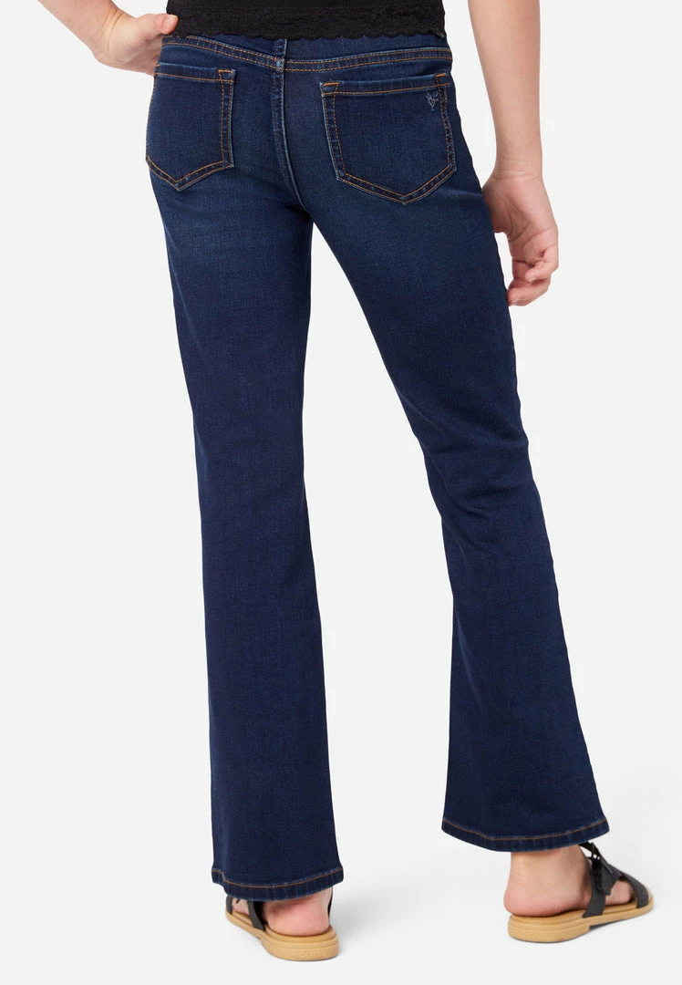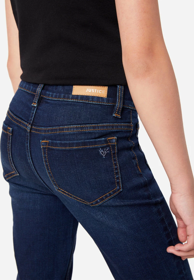 Our girls’ jean leggings have a button fly with contour pull-on waistband—that keeps up with all her movement. Rise in the back prevents gapping. The relaxed fit and subtly flared legs offer classic style. And welted seams make them super-durable. They have two patch pockets in the front and two patch pockets in the back. They’re perfect for pairing with her favorite tees and sweatshirts. Plus, the comfy, stretch-cotton fabric is made with Repreve® denim—which is created using recycled materials. This means not only will your girl look good while wearing her fashion, but she’ll feel good about her fashion, too.Â