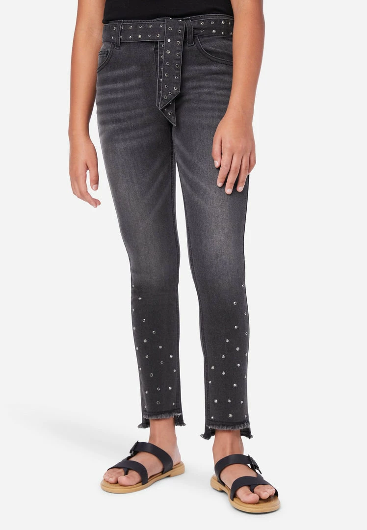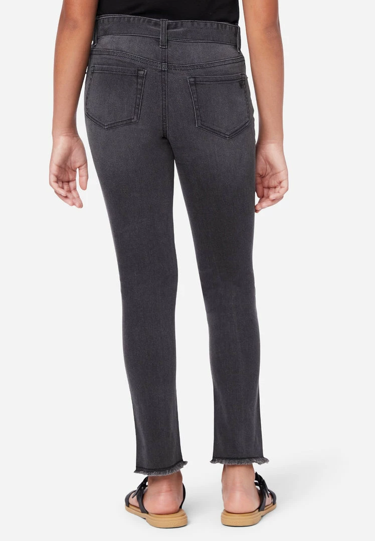 Our girls’ jean leggings have a contour waistband—that keeps up with all her movement. Rise in the back and a grommet-embellished belt prevent gapping. They have a pull-on waistband with a functional button and 5 traditional pockets. Shimmery rhinestones decorate the deconstructed, high-low hemlines. Welted seams make them super-durable. The legging-like fit and mid-rise offer classic style. They’re perfect for pairing with her favorite tees and sweatshirts. Plus, the comfy, stretch-cotton fabric is made with Repreve® denim—which is created using recycled materials. This means not only will your girl look good while wearing her fashion, but she’ll feel good about her fashion, too.Â
