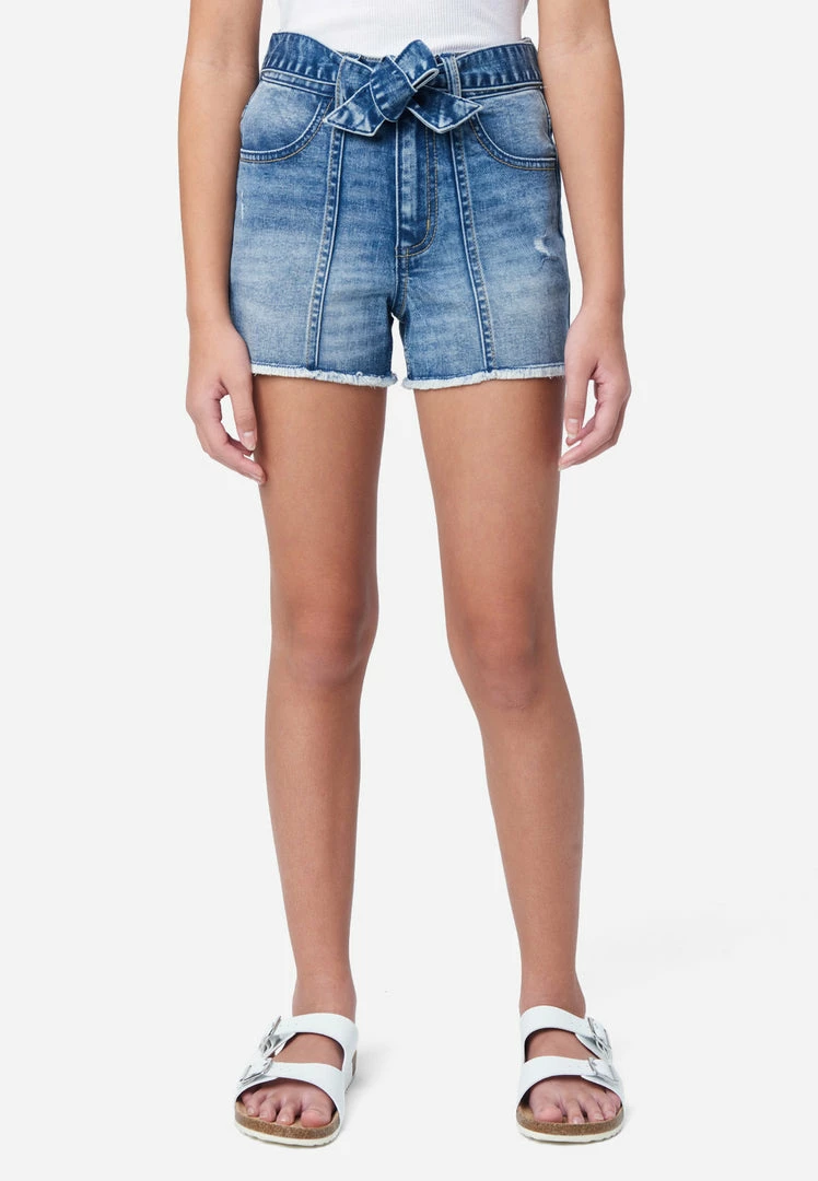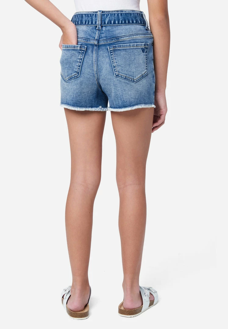 As the weather heats up, so does your girls’ style. Our girls’ mini mom shorts are crafted from soft and stretchy denim that promises daylong comfort. The mid-rise cut makes it a cinch to ease into the vintage feel of this distressed pair. They have a detachable belt that ties at the waist for extra flair. Center seams highlight the front. And fraying finishes the hemline. She’ll love switching up her style by pairing them with tanks and tees from for Everyday Faves collection.