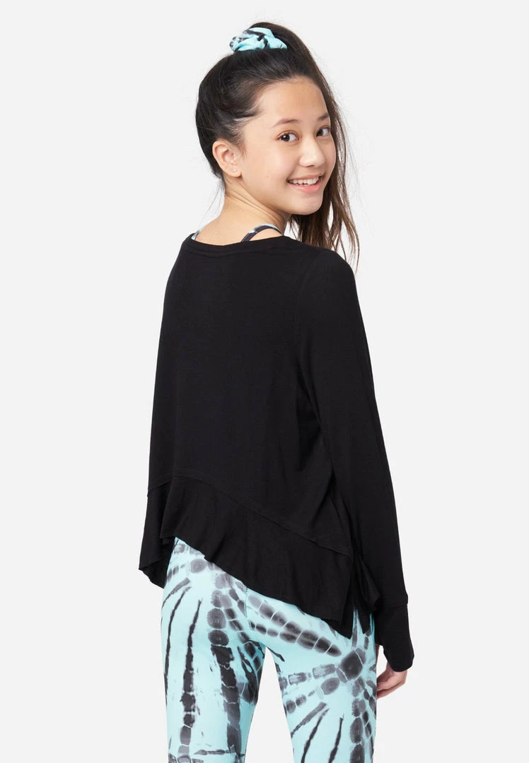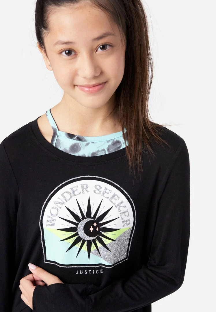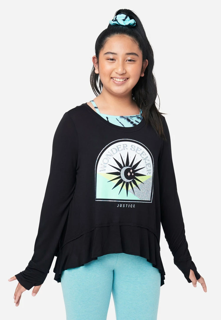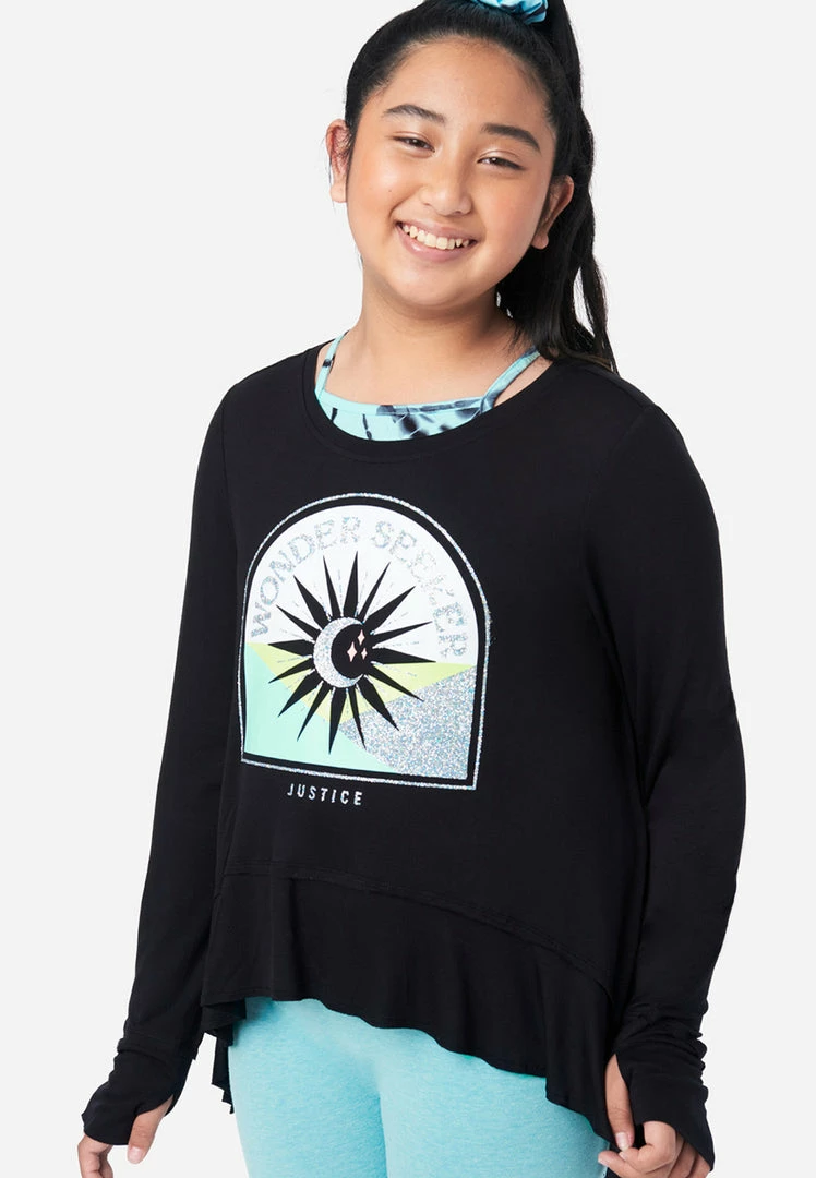 We elevated our girls’ top with all the extra special details Collection X by Justice is known for, like the bold graphic and ruffle-trim along the sidetail hemline. It has a flounce fit and extended long sleeves with thumb holes for extra comfort. The layered design offers on-trend edge with a scoop neckline that shows off just the right amount of the patterned crop top underneath. Plus, it’s a perfect match for patterned leggings and other pieces in this capsule collection.
