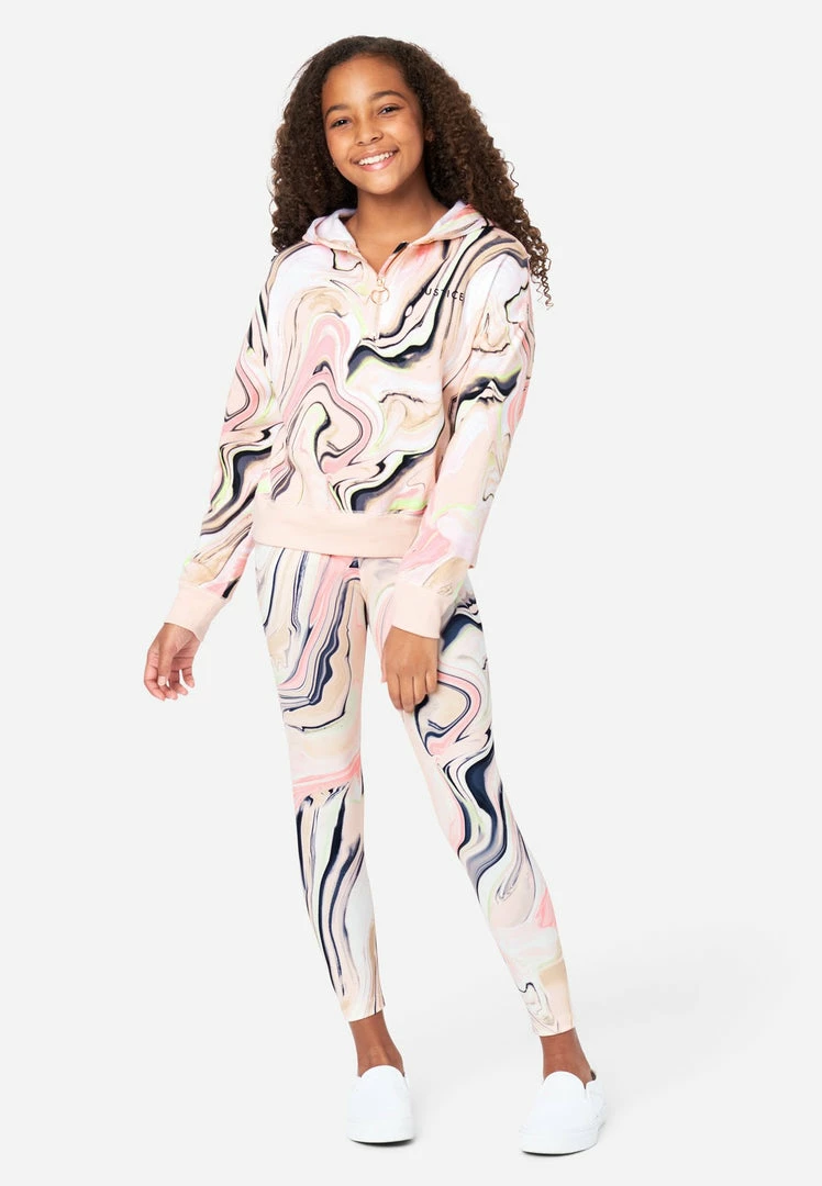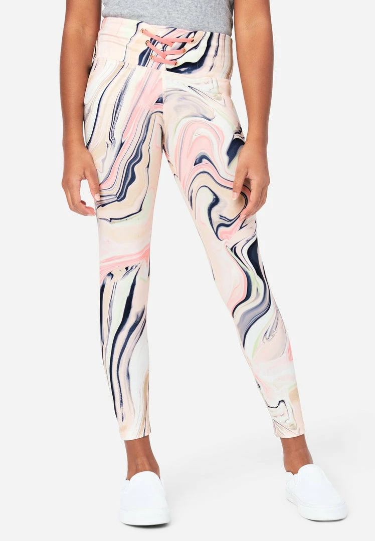 We elevated our girls’ leggings with all the extra-special details Collection X by Justice is known for, like a bold allover pattern, brightly hued lace-front design, and shiny gold grommets. They have wide waistbands and stretchy fabric that’s super-comfy and follows her every movement. Plus, they are a perfect match for hoodies and other pieces in this capsule collection.