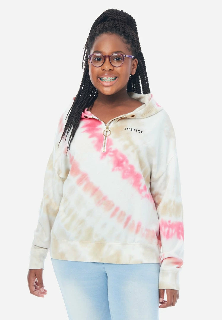 We elevated our girls’ hoodies with all the extra-special details Collection X by Justice is known for, like gold hardware that brings panache charm to the half-zip neckline and offers a hint of shine. A bold allover pattern gives them standout appeal. A Justice logo graphic adorns the front. And the banded hemline and cuffs bring classic style. Your all-star can throw on her hoodie as an extra layer of comfort to wear in the studio to the sidewalk. Plus, she can match it with joggers and other pieces in this capsule collection.