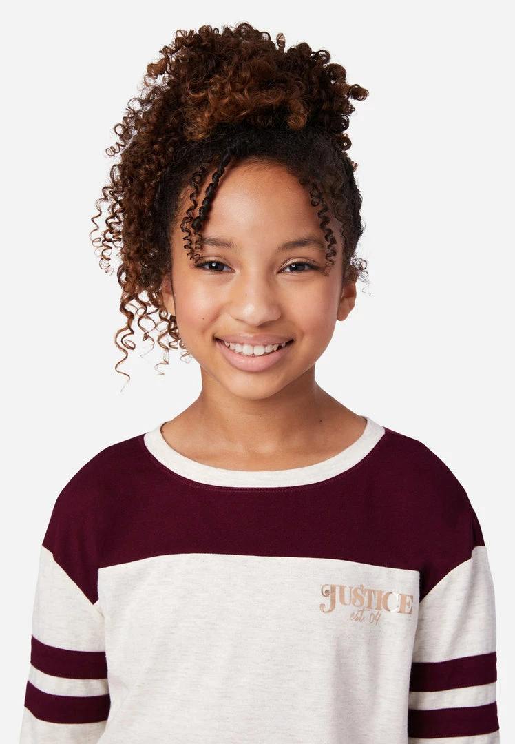 Our girls’ tees sport scoop necklines. The soft, cotton-blend fabric promises comfortable wear. Cool sports stripes and banded cuffs highlight the long sleeves. A shimmery graphic punctuates the front. And they sport playful, easy-to-pair hues that are perfect for mixing and matching with leggings and other essentials in our Everyday Faves collection—which offers tons of value and is perfect for a girl who’s just discovering her own, unique personal style. Plus, they’re made with recycled materials. This means not only will your girl look good while wearing her fashion, but she’ll feel good about her fashion, too.Â