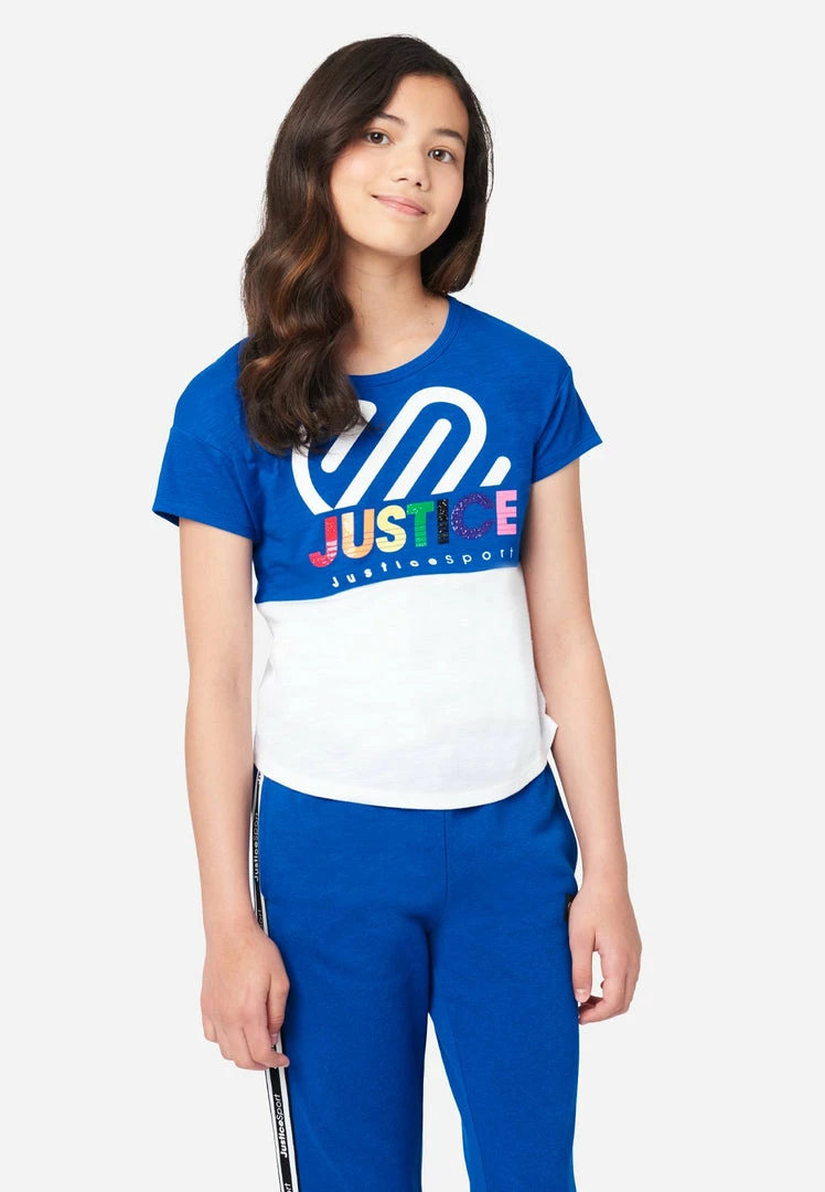 Our girls’ tees have a standout color block design. The slub-jersey cotton-blend fabric is super-soft and promises daylong comfort. A cool graphic highlights the front. The relaxed cut lends full coverage. And the rounded hemline makes sure her tees add structure to outfits—even when untucked.