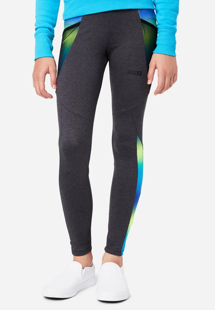 We designed our girls’ leggings with a wide waistband for maximum comfort. A hint of stretch makes sure they keep up with her activities and fast pace. A small graphic highlights one of the legs. They have two slip pockets. We updated them with an ombré color-block design. Plus, seams add visual interest.