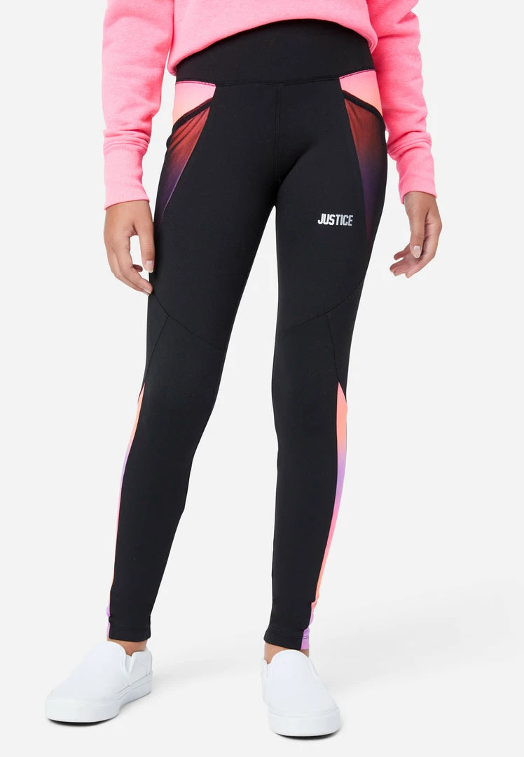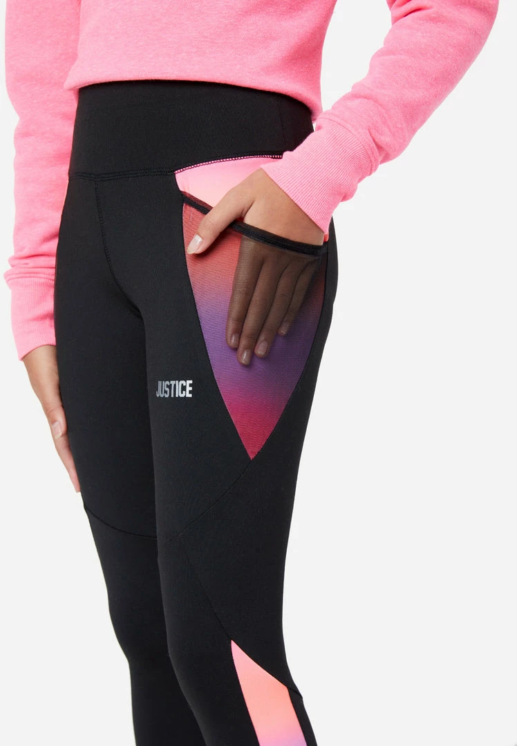 We designed our girls’ leggings with a wide waistband for maximum comfort. A hint of stretch makes sure they keep up with her activities and fast pace. A small graphic highlights one of the legs. They have two slip pockets. We updated them with an ombré color-block design. Plus, seams add visual interest.