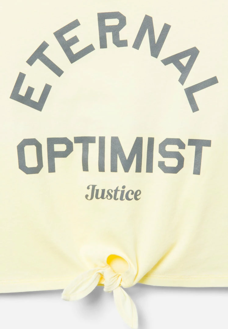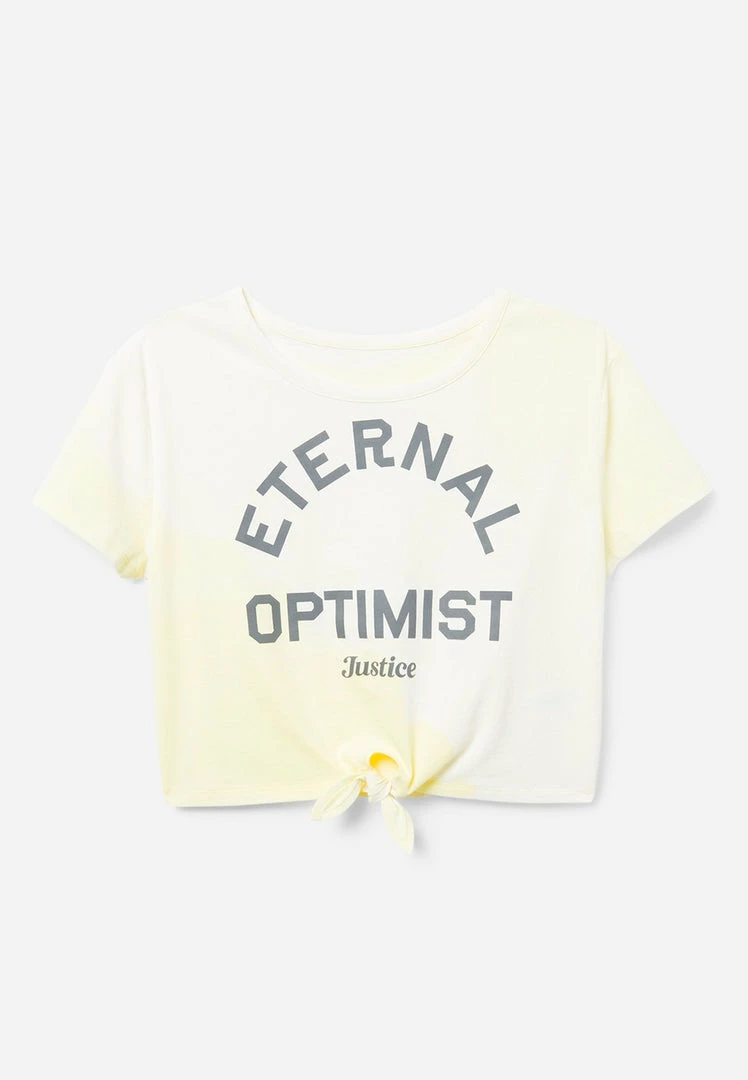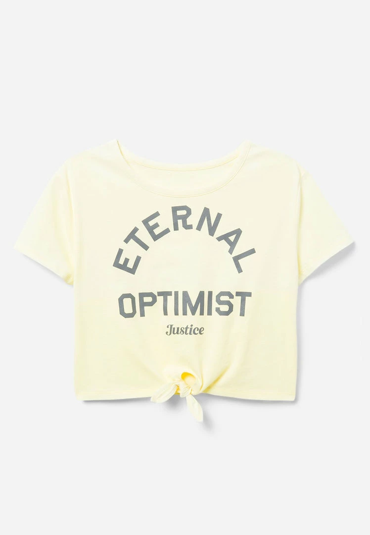Bias binding traces the scoop neckline of our girls’ short sleeve tees. A graphic adorns the front. They tie at the front hemline. And we designed them in lightweight, cotton-blend fabric that changes colors when the temperature rises—they’re perfect for warm days. Plus, they pair perfectly with Justice Denim shorts and jeans.