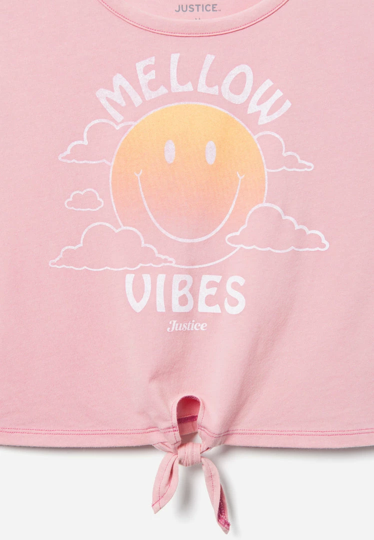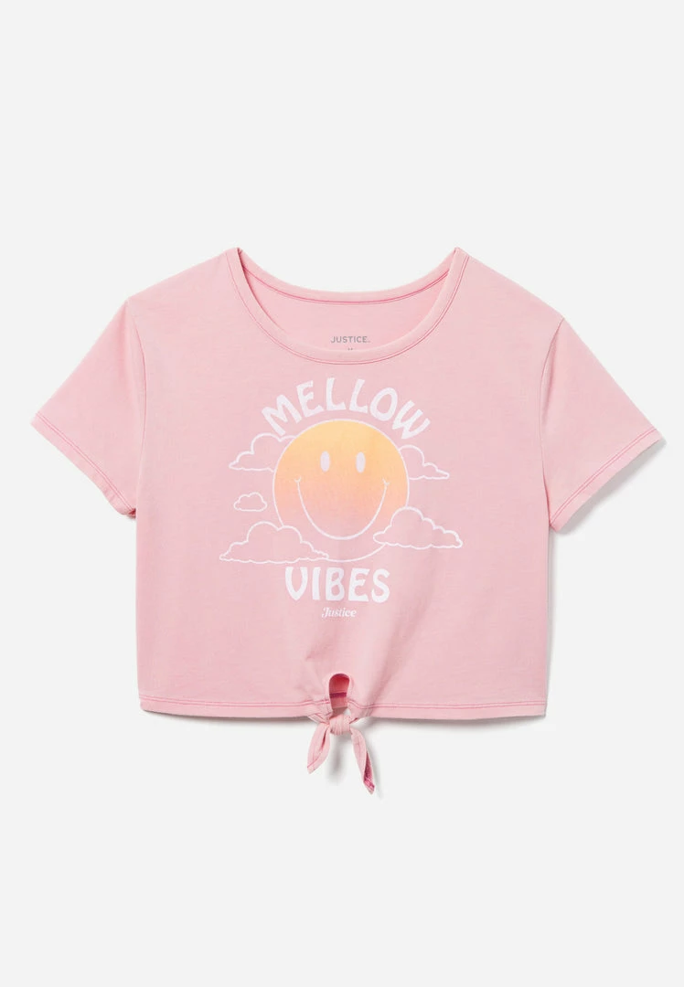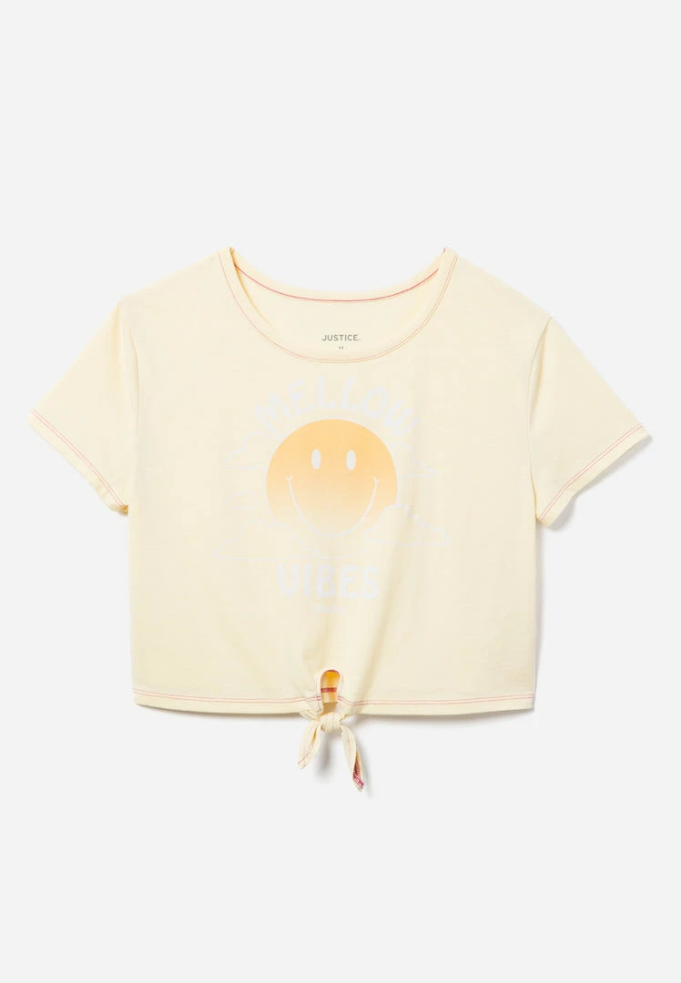 Bias binding traces the scoop neckline of our girls’ short sleeve tees. A graphic adorns the front. They tie at the front hemline. And we designed them in lightweight, cotton-blend fabric that changes colors when the temperature rises—they’re perfect for warm days. Plus, they pair perfectly with Justice Denim shorts and jeans.