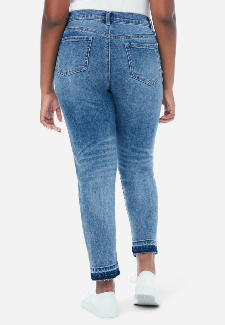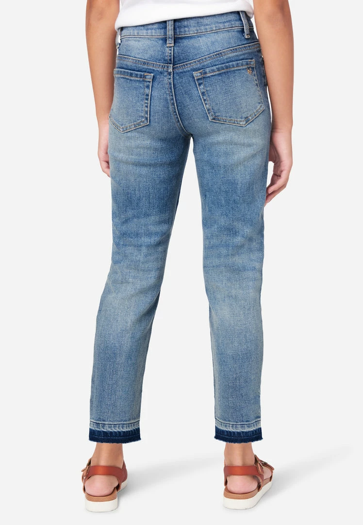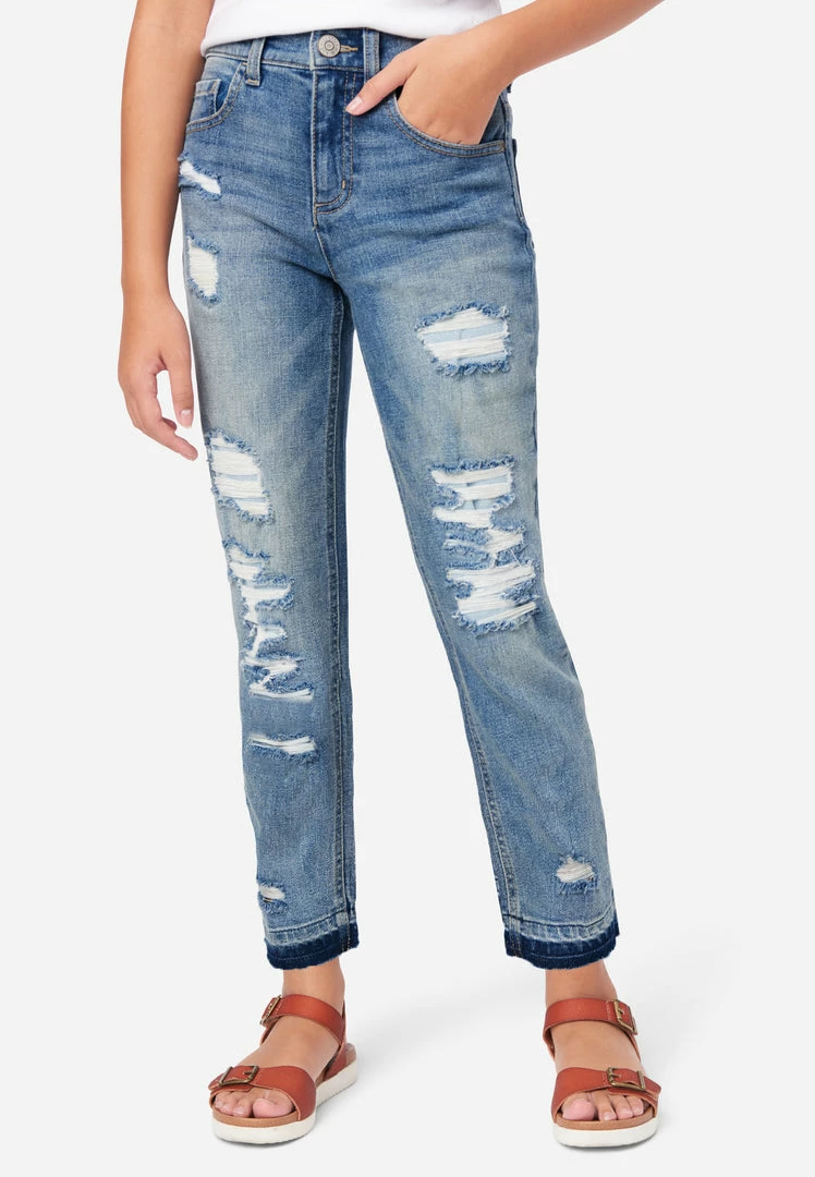 Our girls’ denim jeans are made of comfy, stretch-cotton. They have a relaxed fit, traditional 5 pockets, and a zip-and-button fly. Destructed details with backing promise modesty with edge. The raw, unfinished hemlines bring on-trend appeal. Rise in the back prevents gapping. The mid-rise offers classic style. Welted seams give them durability. They’re perfect for pairing with her favorite tees and sweatshirts.