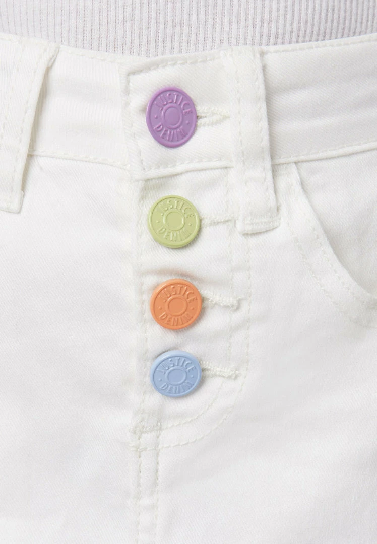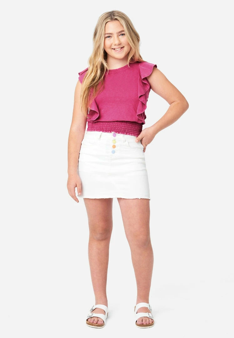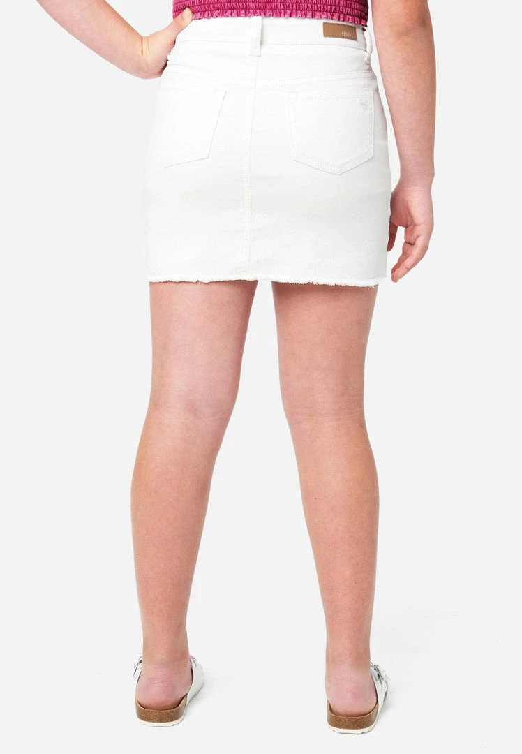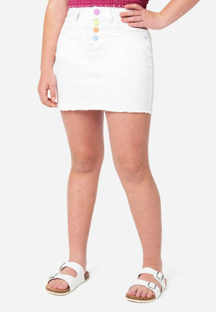 Your girls’ style will never go wrong with a denim skirt, so we designed this one with a light wash to give her style versatility. We made it with stretchy denim that allows her to move with ease. Distressing gives it a vintage feel, while the zip-and-button fly with rainbow buttons offers on-trend appeal. It has a classic mid-rise, belt loops, and slip pockets. And the frayed hemline highlights the mini cut. Pair it with one of our lace-trim camis or graphic tees to complete the look.