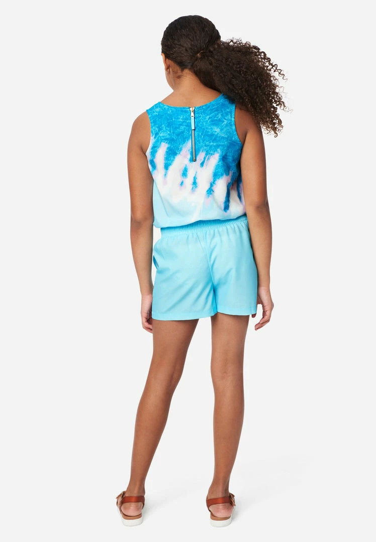 We elevated our girls’ rompers with all the extra-special designs and details Collection X by Justice is known for. The bodice features a scoop neckline and relaxed fit. The cool hues and tie-dye pattern bring eye-catching flavor. Bias binding finishes the neckline and armholes. A bow centers the super-stretchy waistband. A shiny metallic plate punctuates one of the angled patch pockets. She can tuck away her device and other small items.