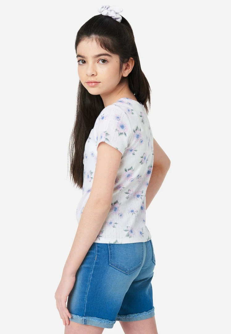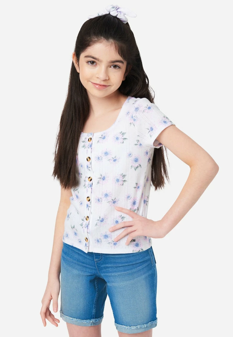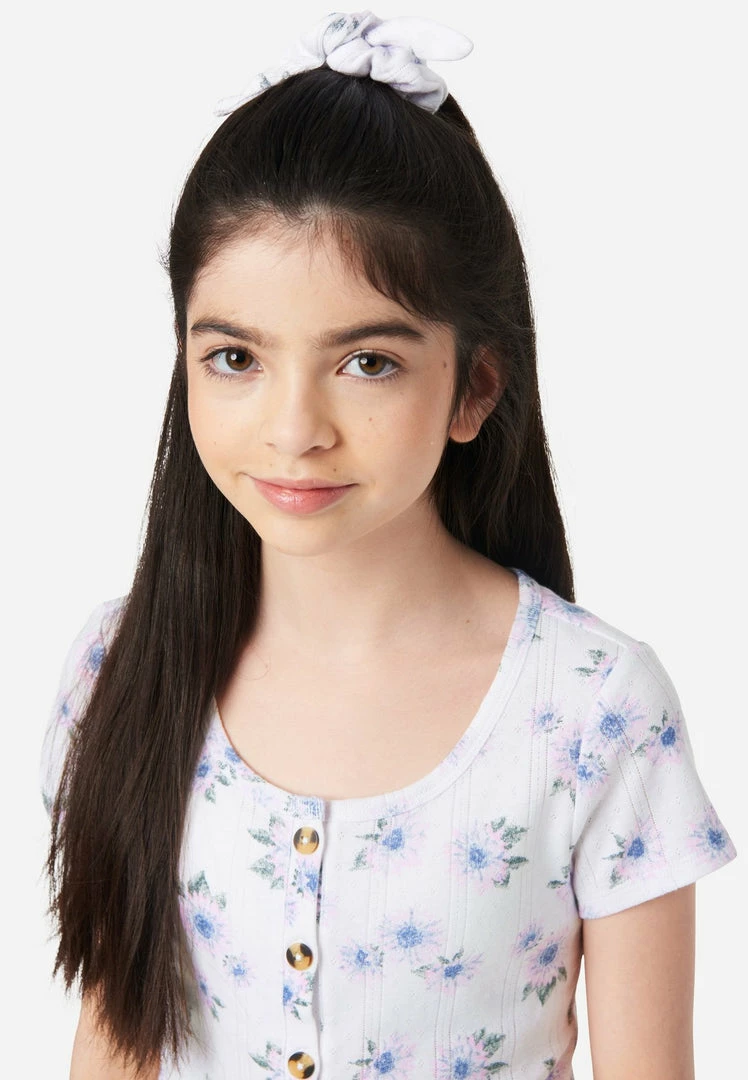 A scoop neckline, short sleeves, and horizontal stripes offer classic style to our girls’ tops. Wood-inspired buttons add natural texture to the front. The cotton-blend fabric promises daylong comfort. Ribbing brings playful texture. And a matching hair tie is perfect for upgrading her updos.