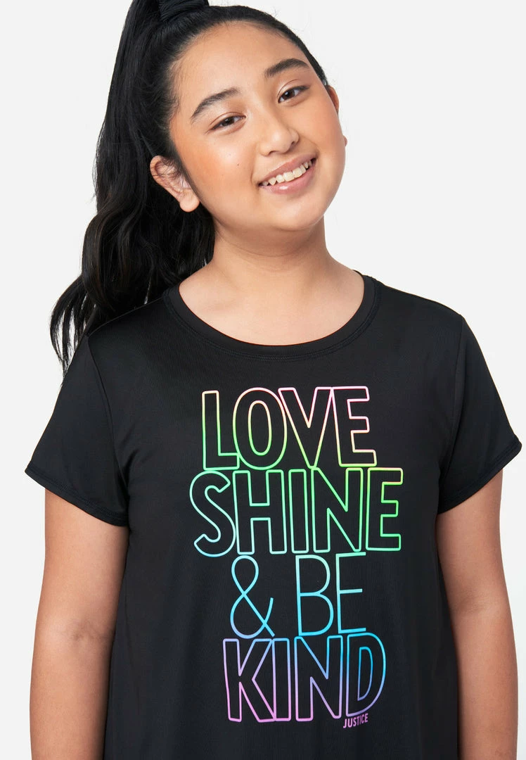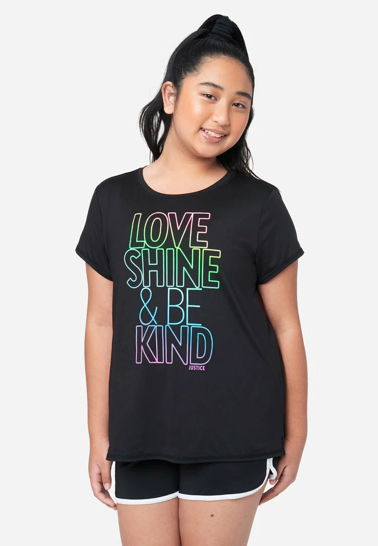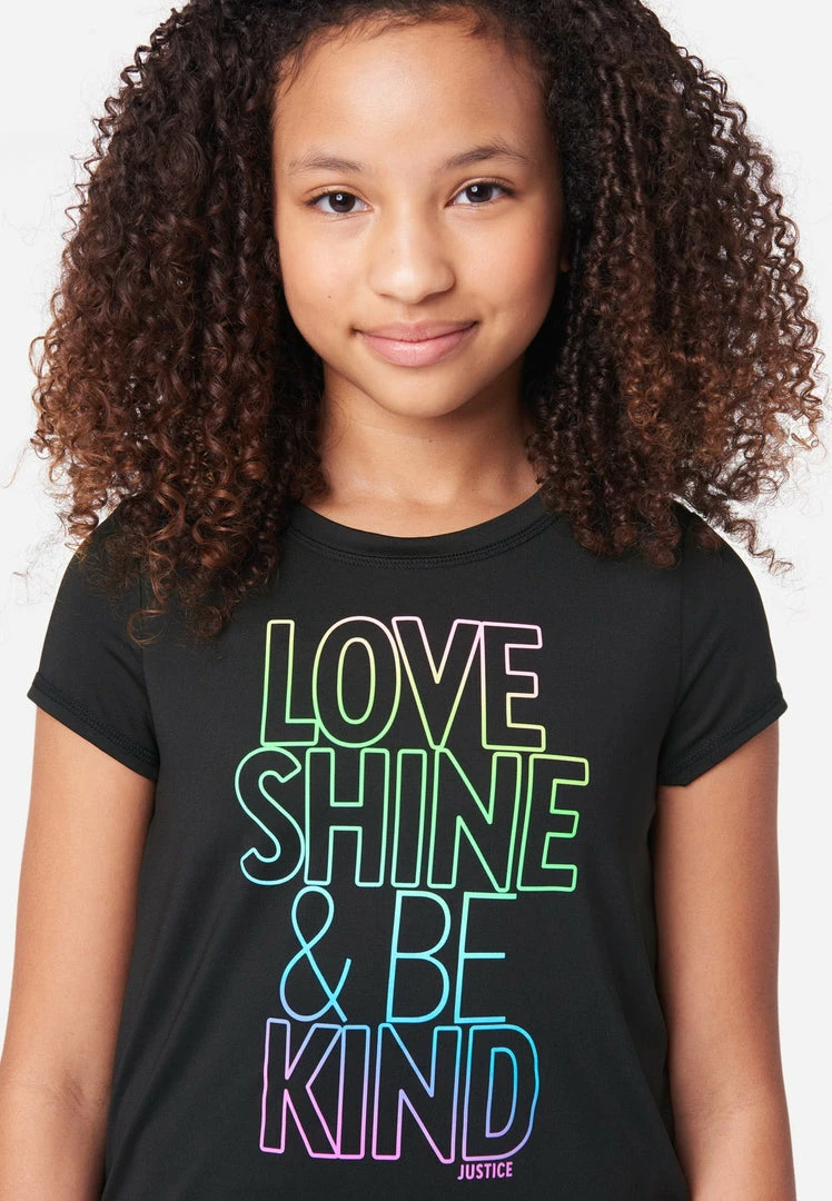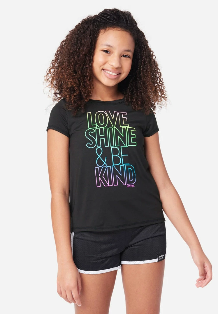 Our girls’ crew neck tees feature a bold graphic that allows your girl to state her stance in the world without saying a word. The relaxed fit and stretchy fabric give her the freedom and comfort of movement throughout her day. She’ll love to pair it with a shorts and leggins from our Everyday Faves collection—which offers tons of value and is perfect for a girl who’s just discovering her own, unique personal style.