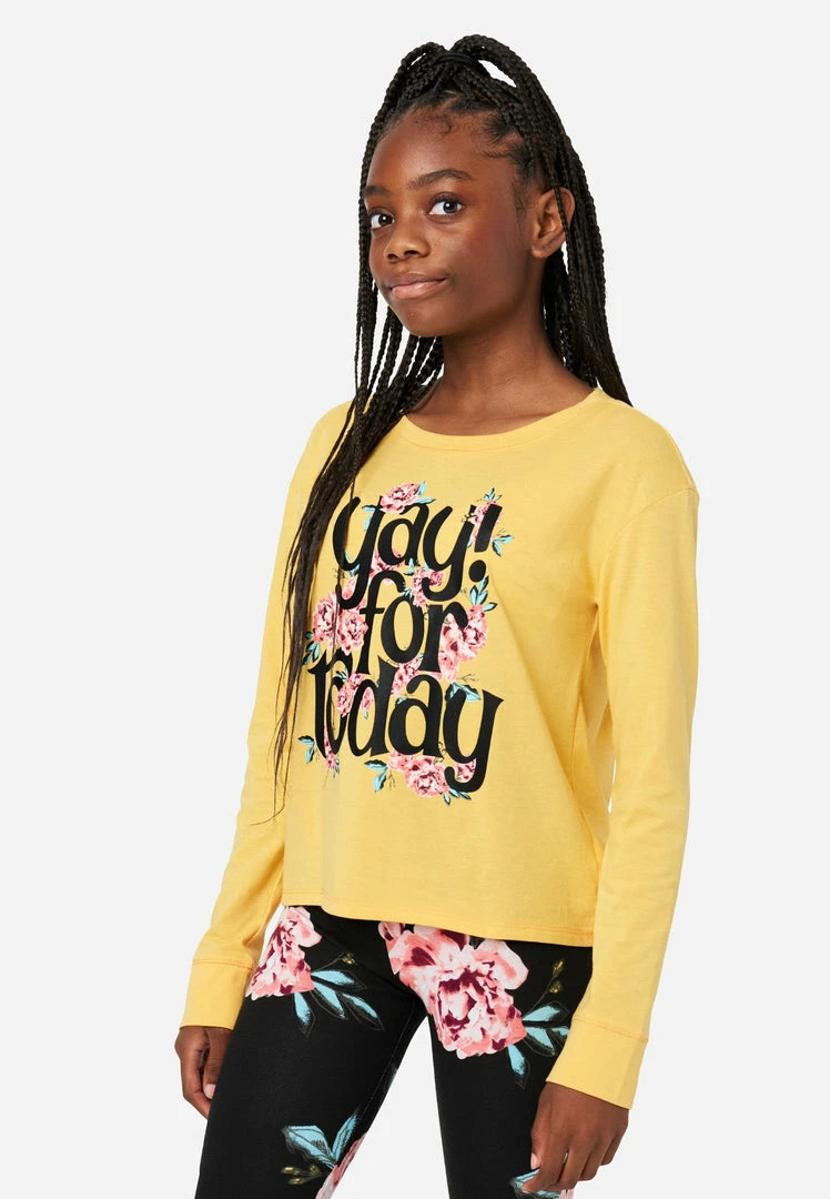 Bold graphics highlight the front of our solid-hued girls’ tees. The crew neckline, long sleeves, and banded cuffs bring classic style. The pullover design makes it easy to layer. And the soft, cotton-blend fabric promises comfortable wear. Plus, they’re made with recycled materials. This means not only will your girl look good while wearing her fashion, but she’ll feel good about her fashion, too. Effortlessly pair them with Justice Denim jeans.