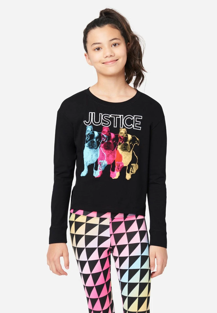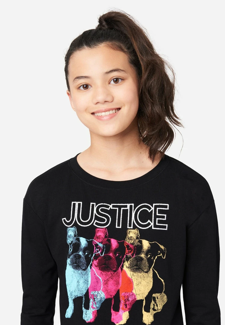 Bold graphics highlight the front of our solid-hued girls’ tees. The crew neckline, long sleeves, and banded cuffs bring classic style. The pullover design makes it easy to layer. And the soft, cotton-blend fabric promises comfortable wear. Effortlessly pair them with Justice Denim jeans. Plus, they’re made with recycled materials. This means not only will your girl look good while wearing her fashion, but she’ll feel good about her fashion, too.