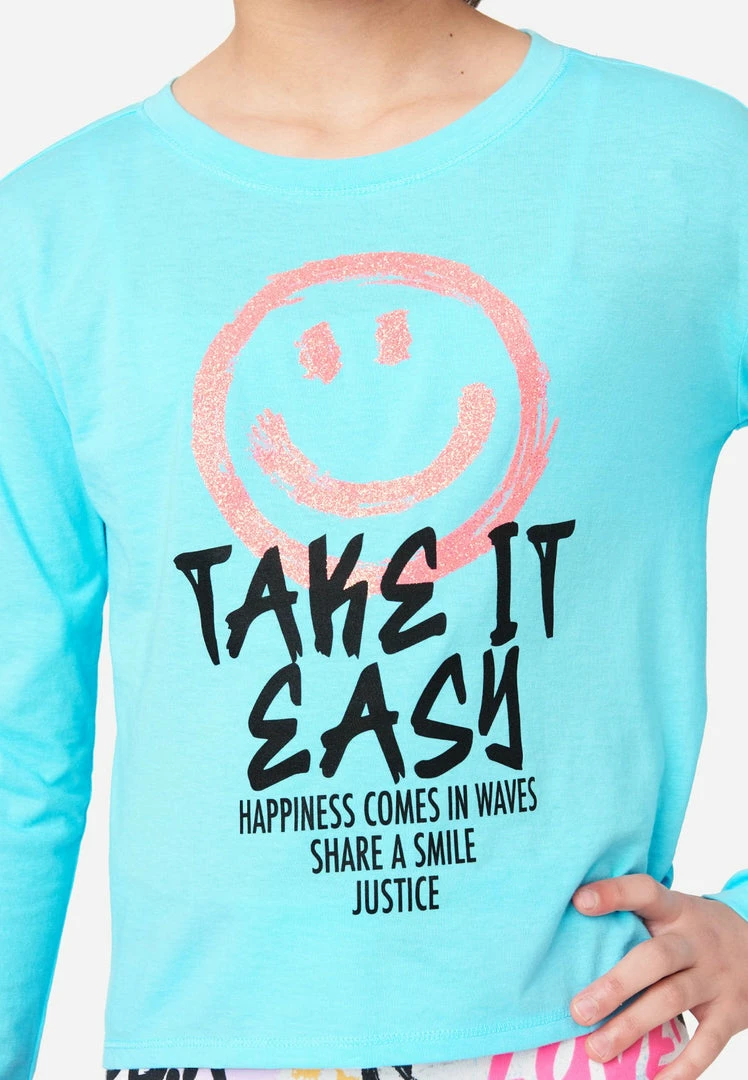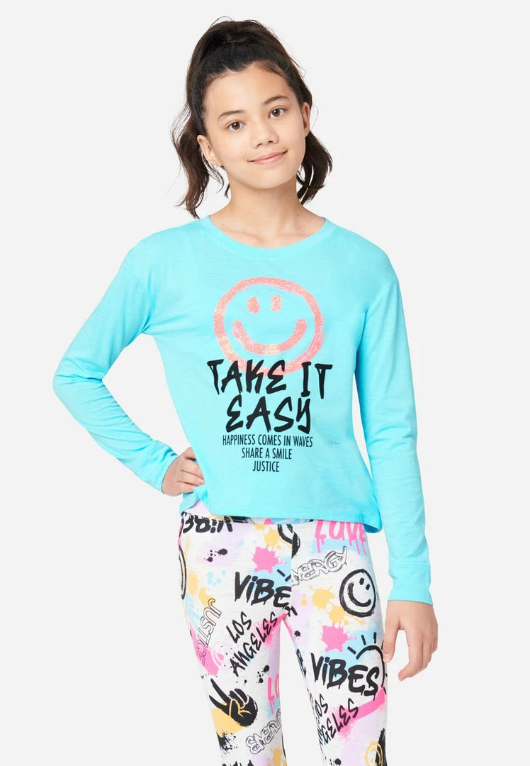 Bold graphics highlight the front of our solid-hued girls’ tees. The crew neckline, long sleeves, and banded cuffs bring classic style. The pullover design makes it easy to layer. And the soft, cotton-blend fabric promises comfortable wear. Effortlessly pair them with Justice Denim jeans. Plus, they’re made with recycled materials. This means not only will your girl look good while wearing her fashion, but she’ll feel good about her fashion, too.