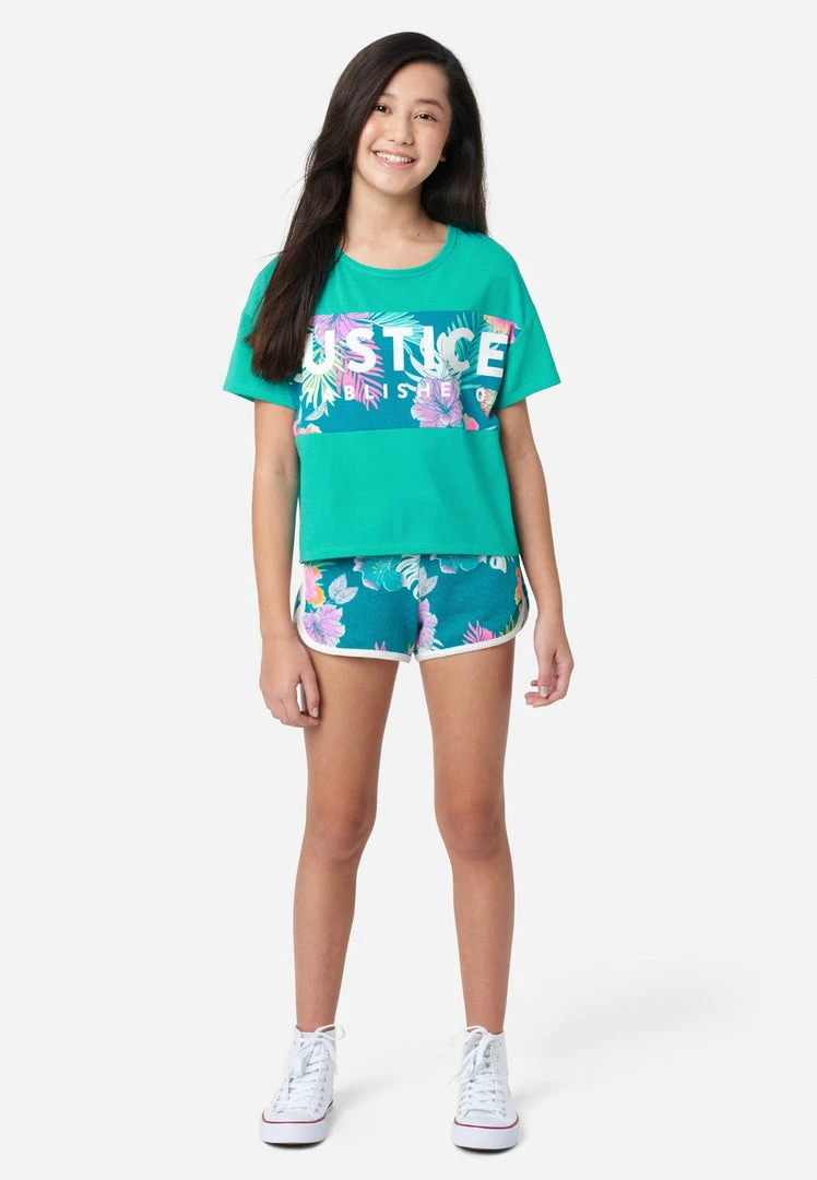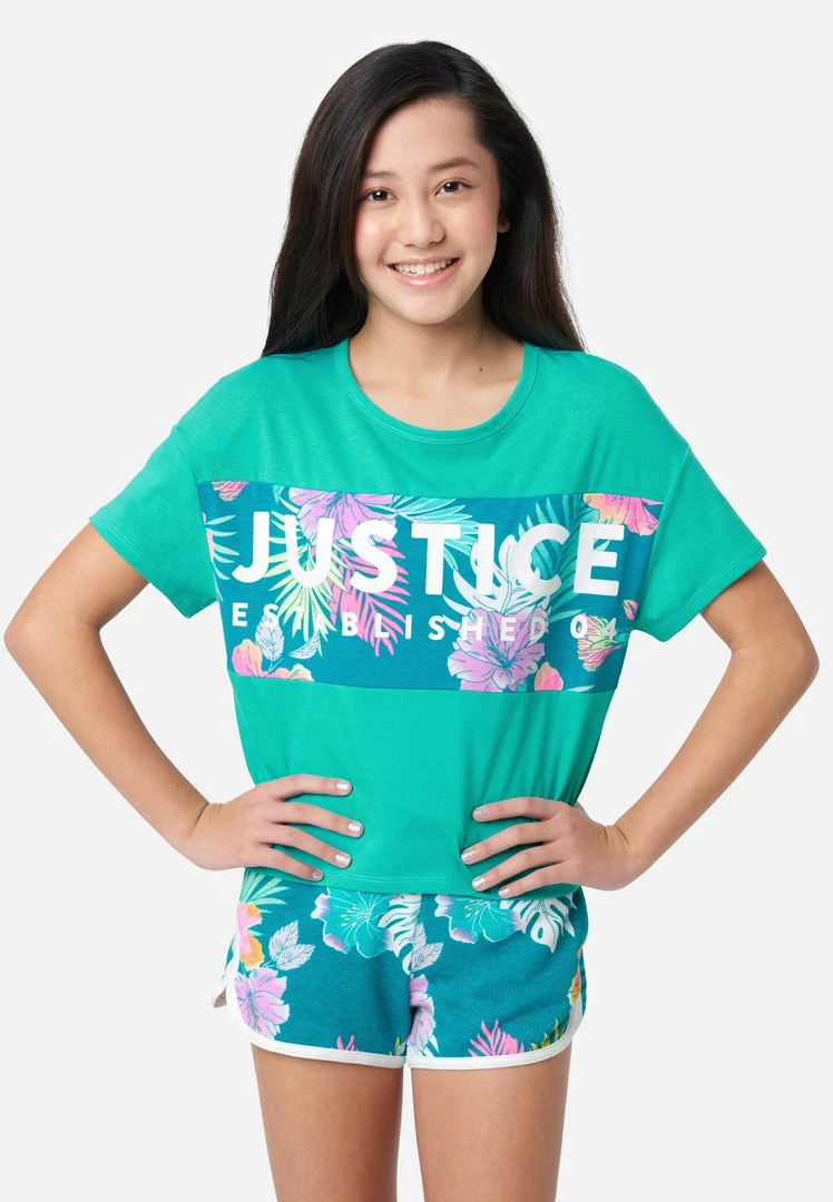 Our girls’ tees are designed with an oversized Justice logo graphic across the front. Bias binding finishes the crew neckline. Drop shoulders highlight the relaxed short sleeves. We designed them with a cropped length to add on-trend appeal. They’re perfect for mixing and matching with shorts, leggings, and other essentials from our Everyday Faves collection—which offers tons of value and is perfect for a girl who’s just discovering her own, unique personal style. Plus, the supersoft fabric is made with recycled materials. Which means not only will your girl look good, but she’ll feel good about showing Mother Nature some love, too.