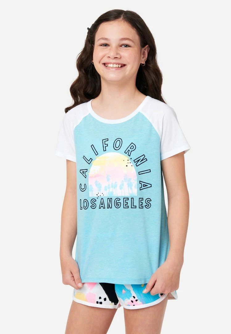 Our girls’ raglan tees have a color block crew neckline and matching sleeves. A bold graphic highlights the front. The soft cotton-blend fabric promises daylong comfort. And they easily pair with Justice Denim shorts.