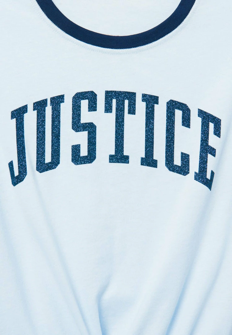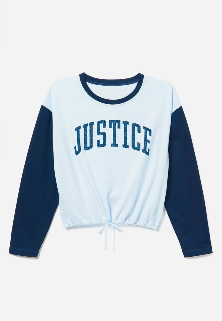Our girls’ raglan tops have a color block crewneck and matching sleeves. A bold, glittering graphic highlights the front. A cinching, drawstring hemline brings an on-trend update to the classic design. The soft cotton-blend fabric promises daylong comfort. And they easily pair with Justice Denim jeans.