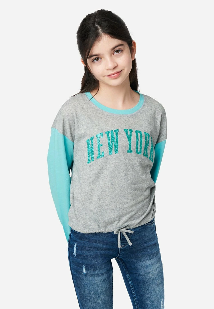 Our girls’ raglan tops have a color block crewneck and matching sleeves. A bold, glittering graphic highlights the front. A cinching, drawstring hemline brings an on-trend update to the classic design. The soft cotton-blend fabric promises daylong comfort. And they easily pair with Justice Denim jeans.