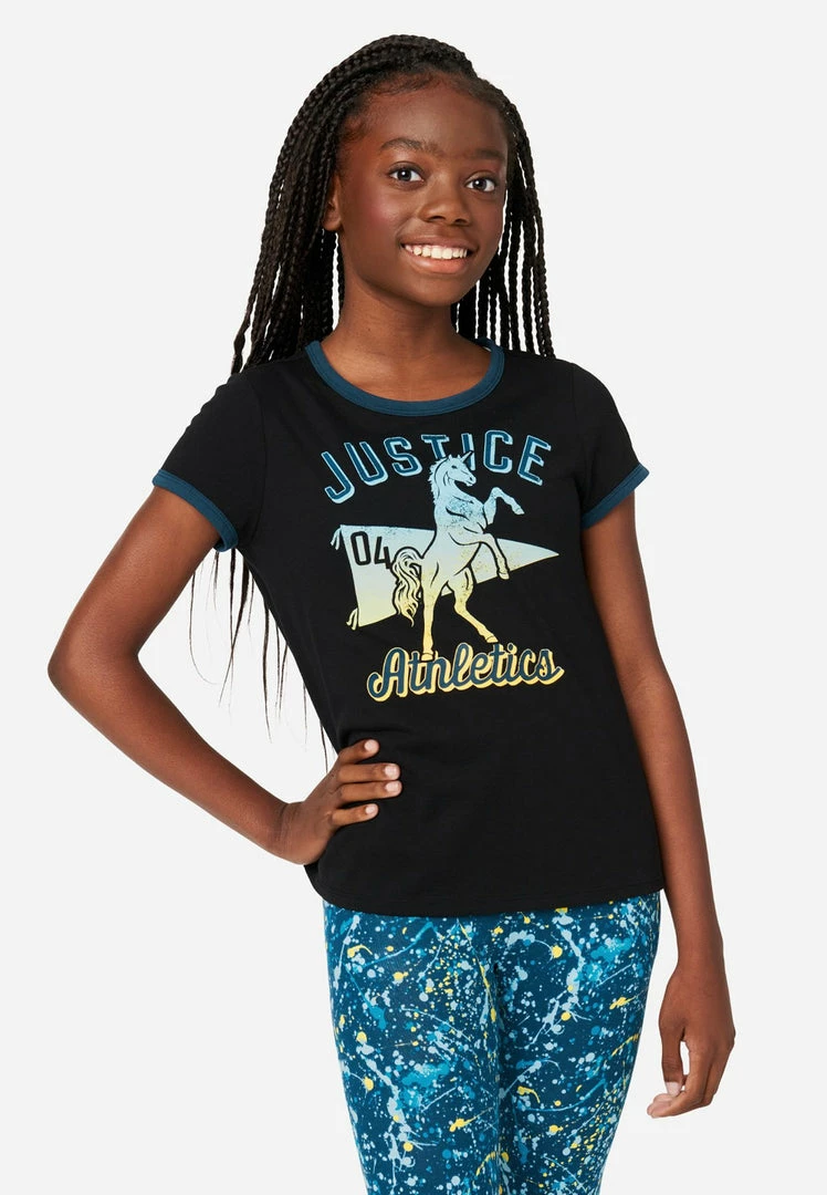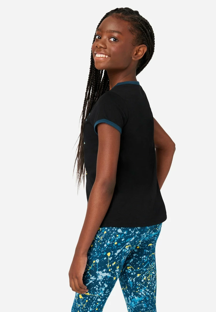 These girls’ tees are our take on the retro ringer style—updated with a bold graphic. Color-block bias binding finishes the scoop neckline and armholes. And we created them in a soft cotton-blend fabric that promises the comfiest wear, ever. Plus, they’re made with recycled materials. This means not only will your girl look good while wearing her fashion, but she’ll feel good about her fashion, too.