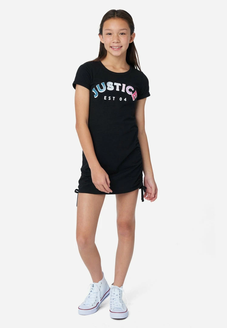 Your girl has a busy day ahead, so we designed our girls’ crewneck t-shirt dress from supersoft cotton jersey that promises daylong comfort. It’s cut for a relaxed fit and has short sleeves. The colorful graphic offers stand out style. And side ties give it a ruched effect.