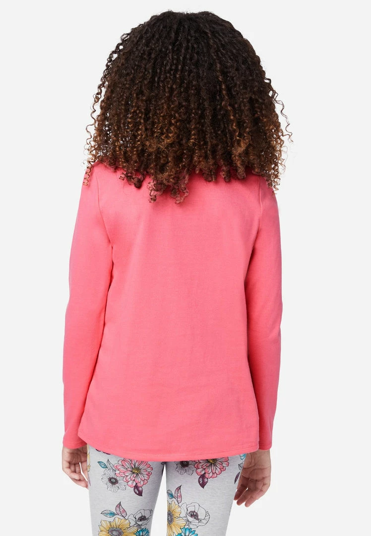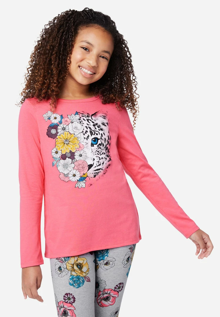 We designed our girls’ tees with a lightweight, cotton-blend fabric  that promises the comfiest wear, ever. Bias binding finishes the neckline. A bold graphic highlights the front. Long sleeves make them perfect for cool days. They sport playful, easy-to-pair hues that are perfect for mixing and matching with leggings and other essentials in our Everyday Faves collection—which offers tons of value and is perfect for a girl who’s just discovering her own, unique personal style. Plus, they’re made with recycled materials. This means not only will your girl look good while wearing her fashion, but she’ll feel good about her fashion, too.Â