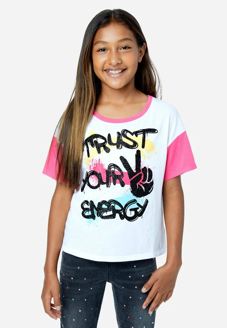 Our girls’ tees have a standout color-block design. The cotton-blend fabric is super-soft and promises daylong comfort. Bias binding finishes the scoop neckline. A cool graphic highlights the front. And the relaxed cut gives them a cozy fit. Plus, they’re made with recycled materials. This means not only will your girl look good while wearing her fashion, but she’ll feel good about her fashion, too.