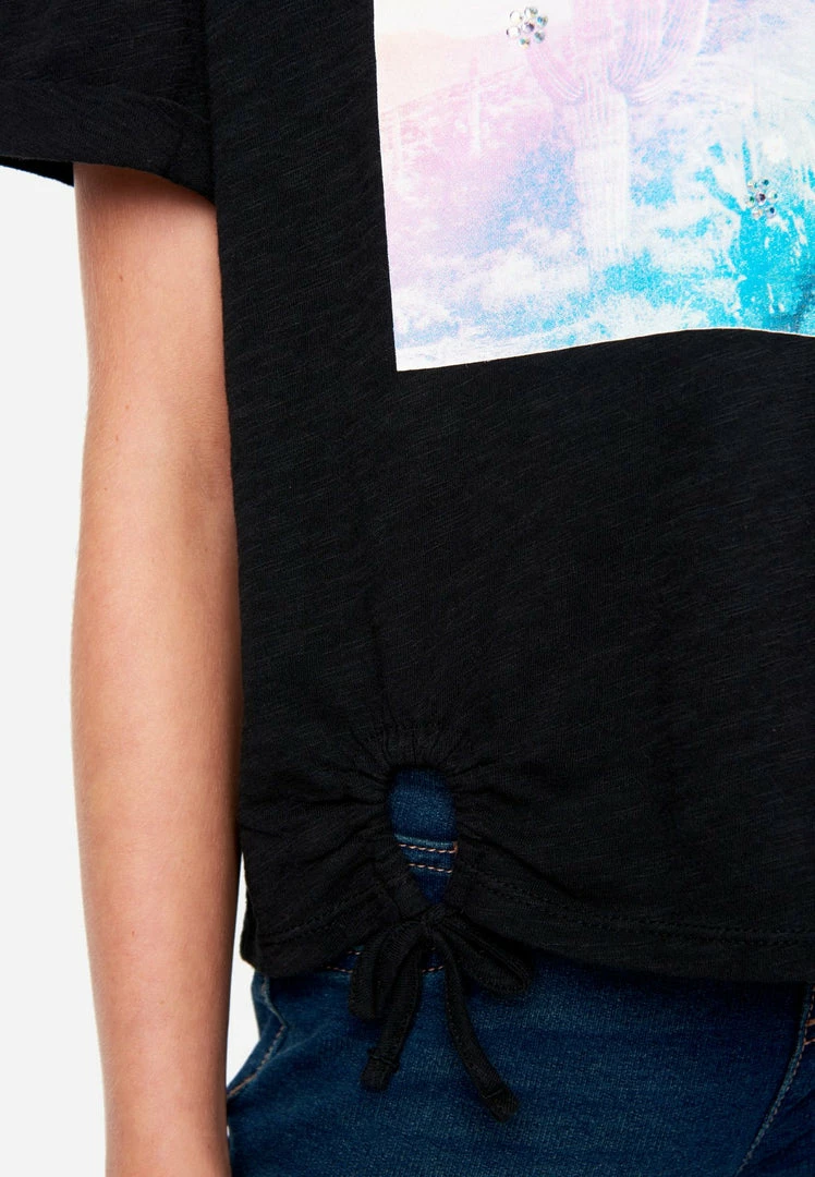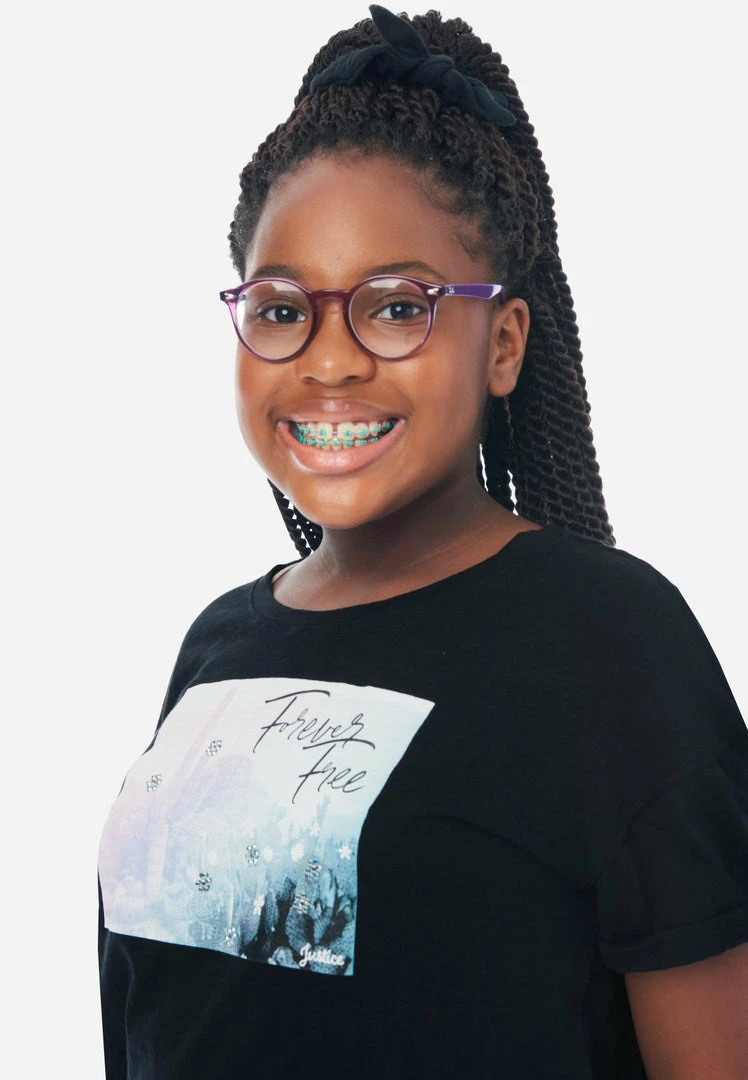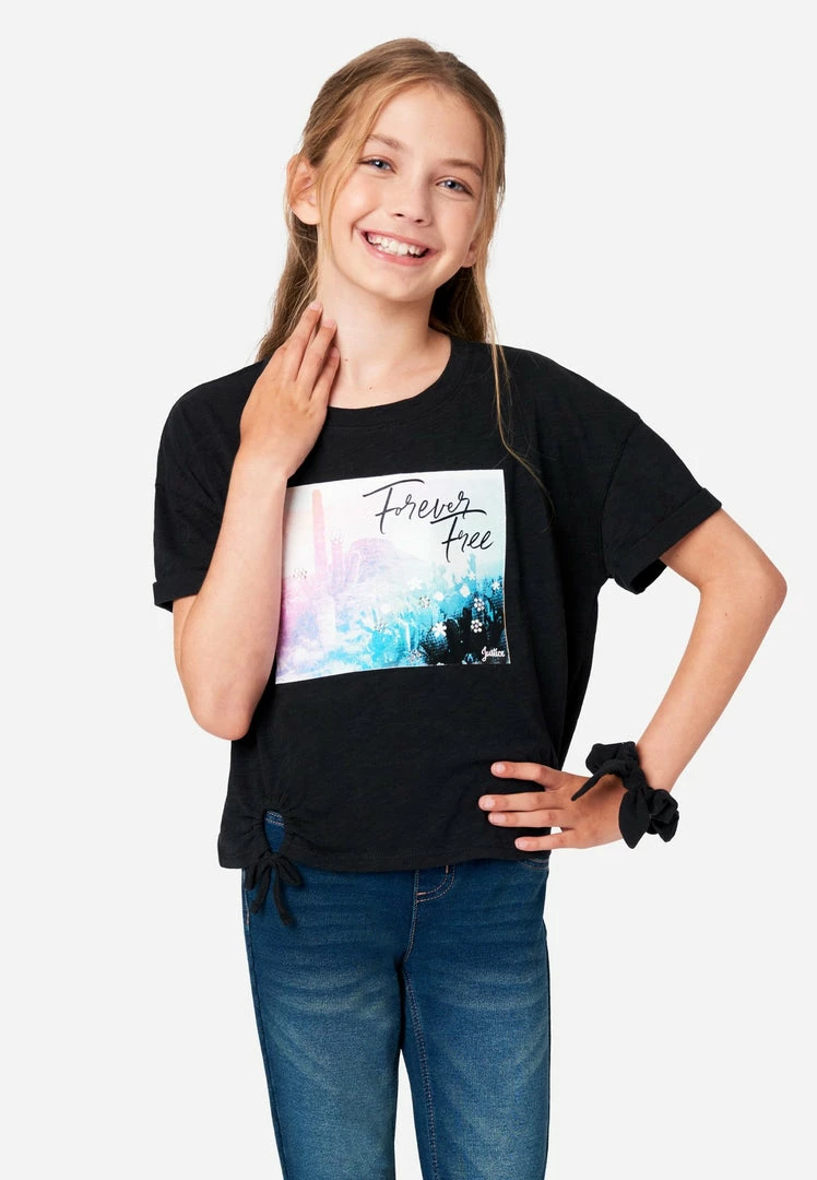We created a line of tees for your free-spirited girl. The front has a scoop neckline, plus a graphic boasts an affirming message. Cuffs bring a pop of personality to the short dolman sleeves. A keyhole punctuates the front hemline and ties into a sweet bow. They’re designed in slub-jersey cotton that promises the comfiest wear, ever. And the matching hair tie is perfect for upgrading her updos. They pair perfectly with Justice Denim jeans.