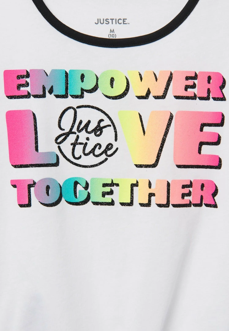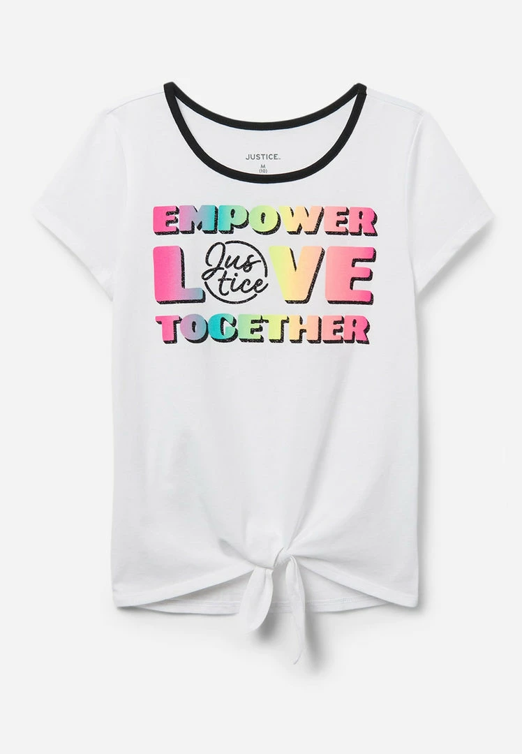 This is our take on the retro ringer style. We updated it with contrast bias binding around a scoop neckline and a tie at the front hemline. A graphic with positive sentiments adorns the front. And we designed our girls’ tees in a lightweight cotton-blend fabric that promises the comfiest wear, ever. Plus, they’re available in an array of easy-to-pair hues that are perfect for mixing and matching with leggings, shorts, and other essentials in our Everyday Faves collection—which offers tons of value and is perfect for a girl who’s just discovering her own, unique personal style.