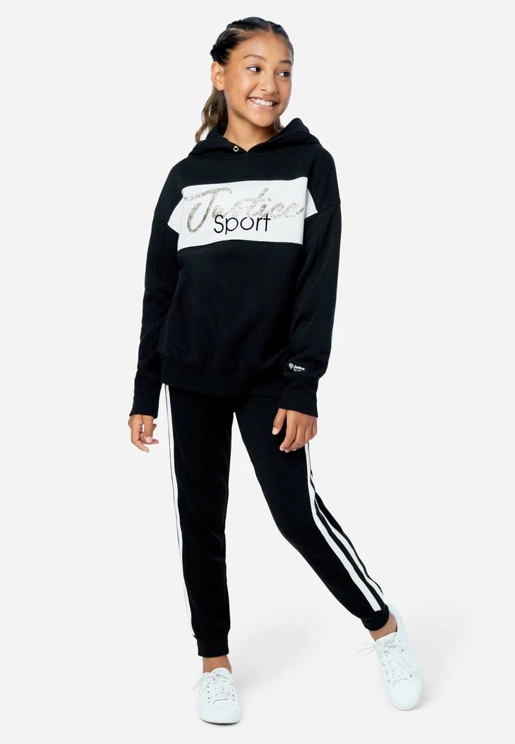 Our cozy girl’s hooded sweatshirt, designed from soft cotton-blend fabric, will be her everyday layering staple. Its relaxed silhouette gives her room to move with ease in all-day comfort. And it is complete with our J Sport logo across the front for an athletic appeal. In addition, she can effortlessly pair it with our coordinating joggers in this capsule collection or Justice Denim jeans.