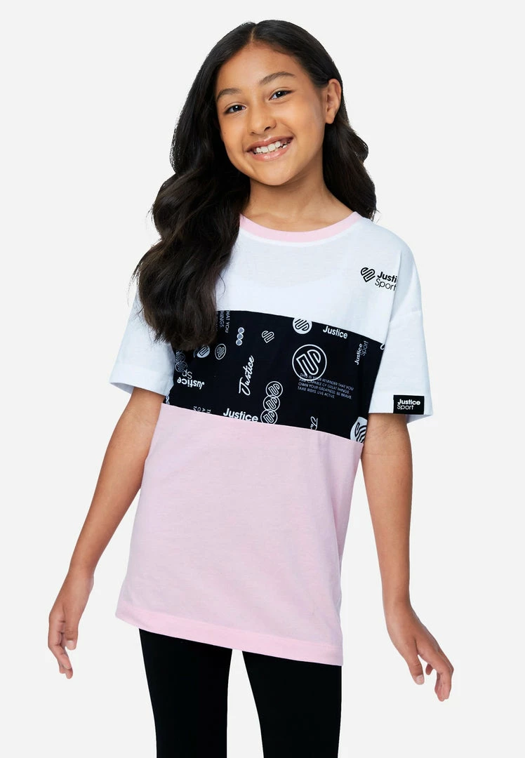Our girls’ tees have a standout color block design. A contrasting hue finishes the neckline. A cool graphic highlights the front. A Justice Sport tag punctuates one of the sleeves. The soft cotton-blend fabric promises daylong comfort. And the trendy oversized cut lends full coverage and makes them perfect for layering over leggings and other bottoms in our J Sport collection.