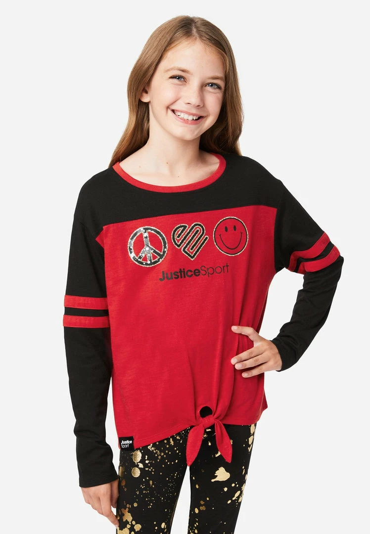 Our girl’s long sleeve tee has a sparkling graphic message at the front–for her style to shine as bright as her personality. It’s crafted from a soft cotton-blend made with recycled materials, so your girl will look as good as she feels. Its striped design on the sleeves and tie-front hemline highlights its athletic appeal and effortlessly pairs with leggings or joggers from our J Sport collection.Â