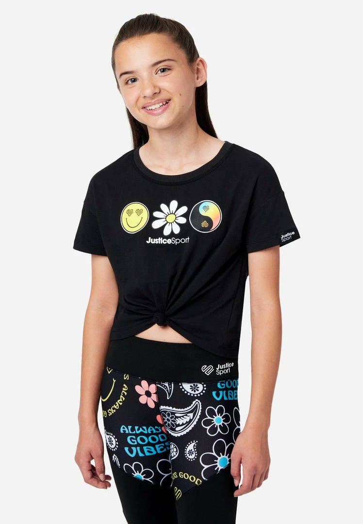 A super-cute tee with a sporty streak. The effortless short-sleeved design rocks a knotted front, an unexpected twist to the classic tee silhouette. The shine graphics are all about the good vibes with Justice Sport illustrations sending a positive message.