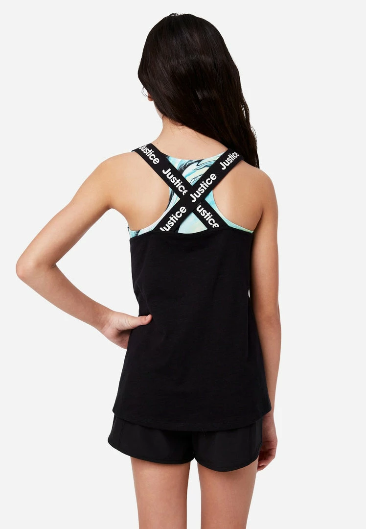 We created our girls’ tanks in a comfy cotton-blend fabric that promises durability for wear after wear. A layered design brings on-trend edge. Bias binding finishes the neckline and armholes. The crisscross straps are designed with color block logo tape. Bold graphics highlight the front. And a faux base-layer tank adds modesty and flair to the look.Â