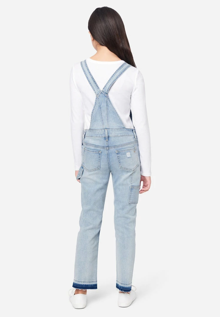 Our girls’ jean overalls have comfy stretch fabric is made with Repreve® denim—which is created using recycled materials. This means not only will your girl look good wearing her fashion, but she’ll feel good about her fashion, too. The relaxed fit and subtly flared legs offer classic style. Welted seams make them super-durable. Destructed details with backing promise modesty with edge. Slip pockets, in the front and back, are perfect for tucking away small items. Additional carpenter pockets and rose gold hardware add flair. And the raw, unfinished hemline brings on-trend appeal.