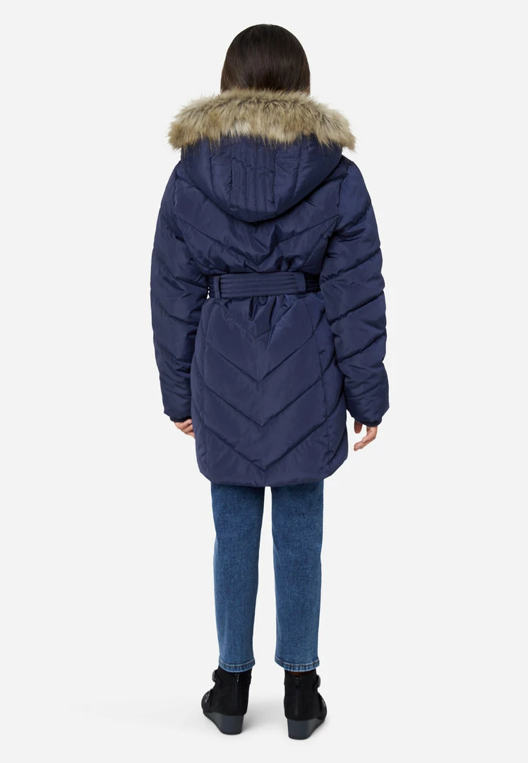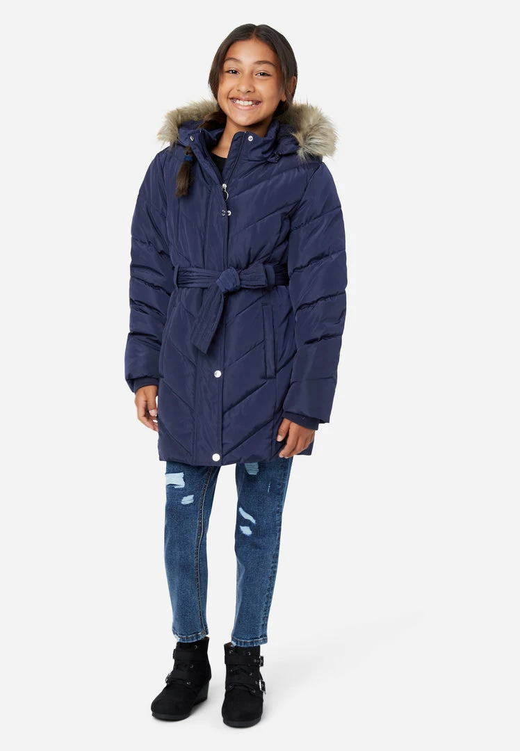 Chevron quilting gives our girl’s zip-up coat classic, allover texture. The detachable hood has a soft faux fur trim that shields her on windy days. A storm flap protects the zipper. A removable belt cinches at the waist—giving it a secure fit. Two slit pockets are perfect for tucking small items away. And ribbed storm cuffs keep cool air at bay.