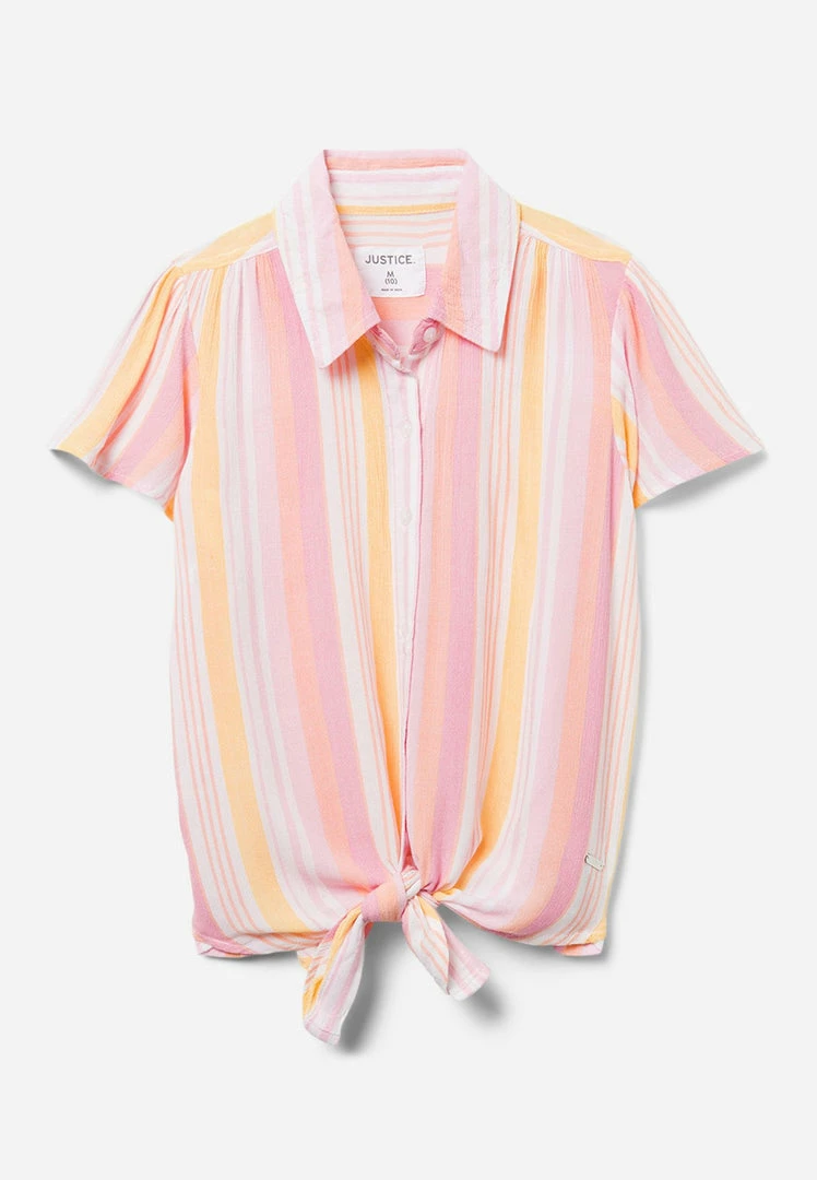 Our girls’ tops are made with lightweight, airy fabric that promises the breeziest, comfiest wear, ever. The collar and short sleeves lend classic style. A tie punctuates the front hemline. The button-up design makes them easy to pair. And a vibrant allover pattern lends standout appeal. They pair perfectly with Justice Denim shorts and jeans.