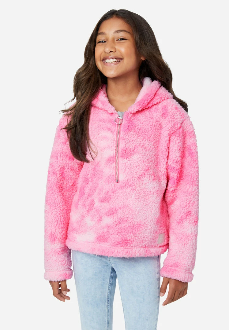 We designed our girls’ hoodies in ultrasoft faux sherpa that makes all her looks extra comfy. A ring punctuates the shiny half-zipper. A subtle allover pattern brings artful texture to her looks. A Justice logo patch adorns the front. And the hood keeps the cool air at bay on brisk days. Â