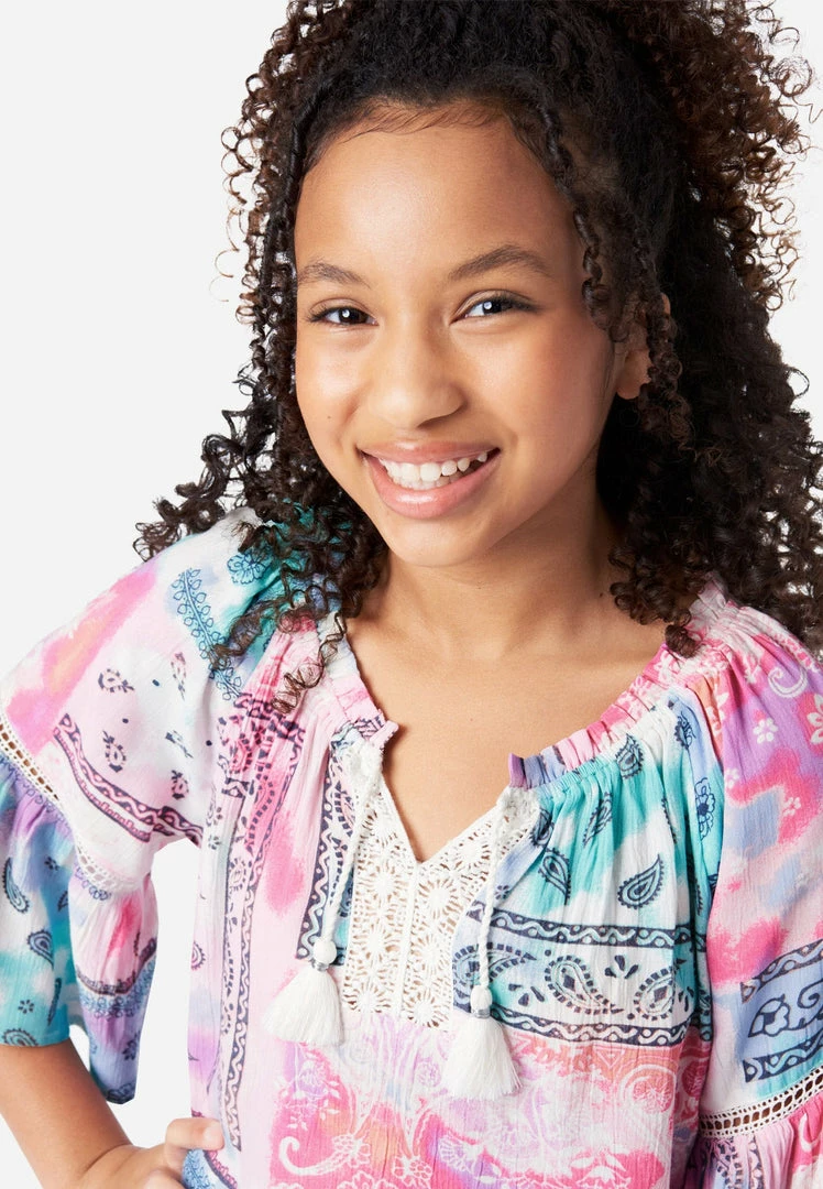 Let your girl catch a bohemian vibe with our girls’ patterned top. Its flowy design and soft woven fabric promise the ultimate comfort. The split neckline with tassel ties is perfect for her necklaces. Embroidery and ruffles trim the three-quarter length bell sleeves. And the high-low hemline will look great styled with a pair of jeggings or jeans from our denim shop.