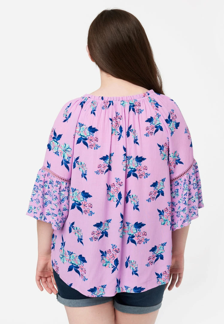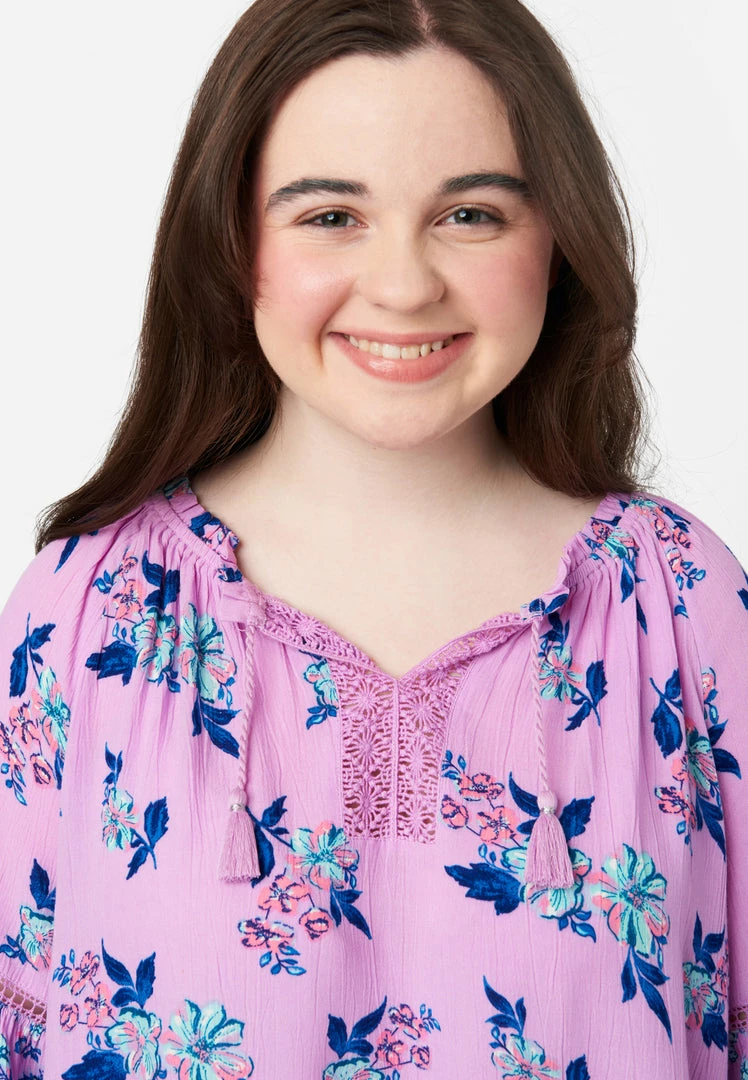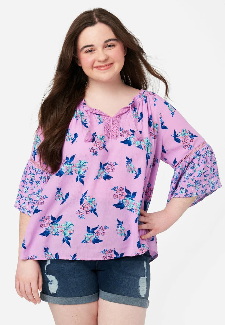 Let your girl catch a bohemian vibe with our girls’ patterned top. Its flowy design and soft woven fabric promise the ultimate comfort. The split neckline with tassel ties is perfect for her necklaces. Embroidery and ruffles trim the three-quarter length bell sleeves. And the high-low hemline will look great styled with a pair of jeggings or jeans from our denim shop.