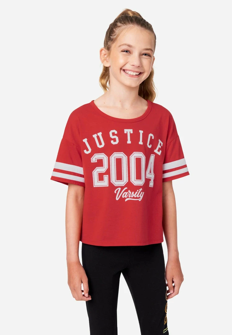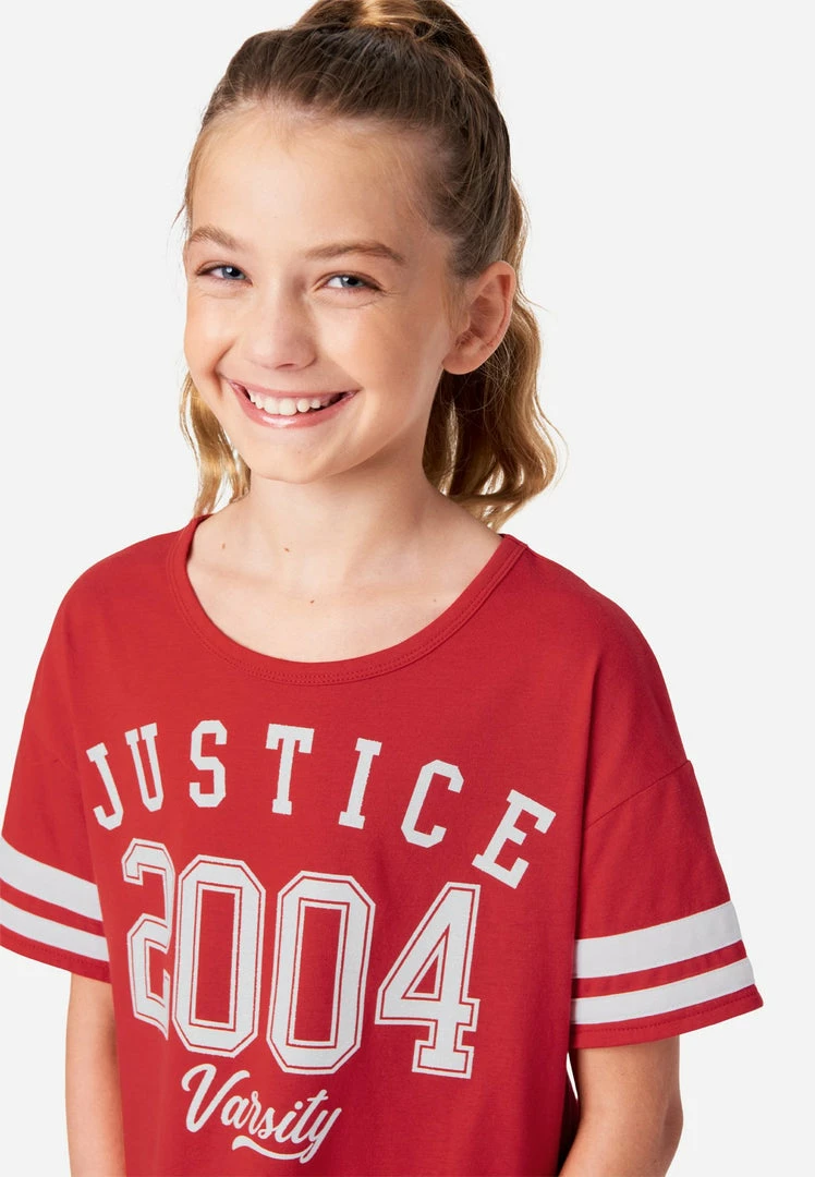 Our girls’ tees sport scoop necklines. The soft, cotton-blend fabric promises comfortable wear. Cool sports stripes pop against the bright hue. And a bold graphic punctuates the front. They’re a perfect match for Justice Denim jeans. Plus, they’re made with recycled materials. This means not only will your girl look good while wearing her fashion, but she’ll feel good about her fashion, too.Â