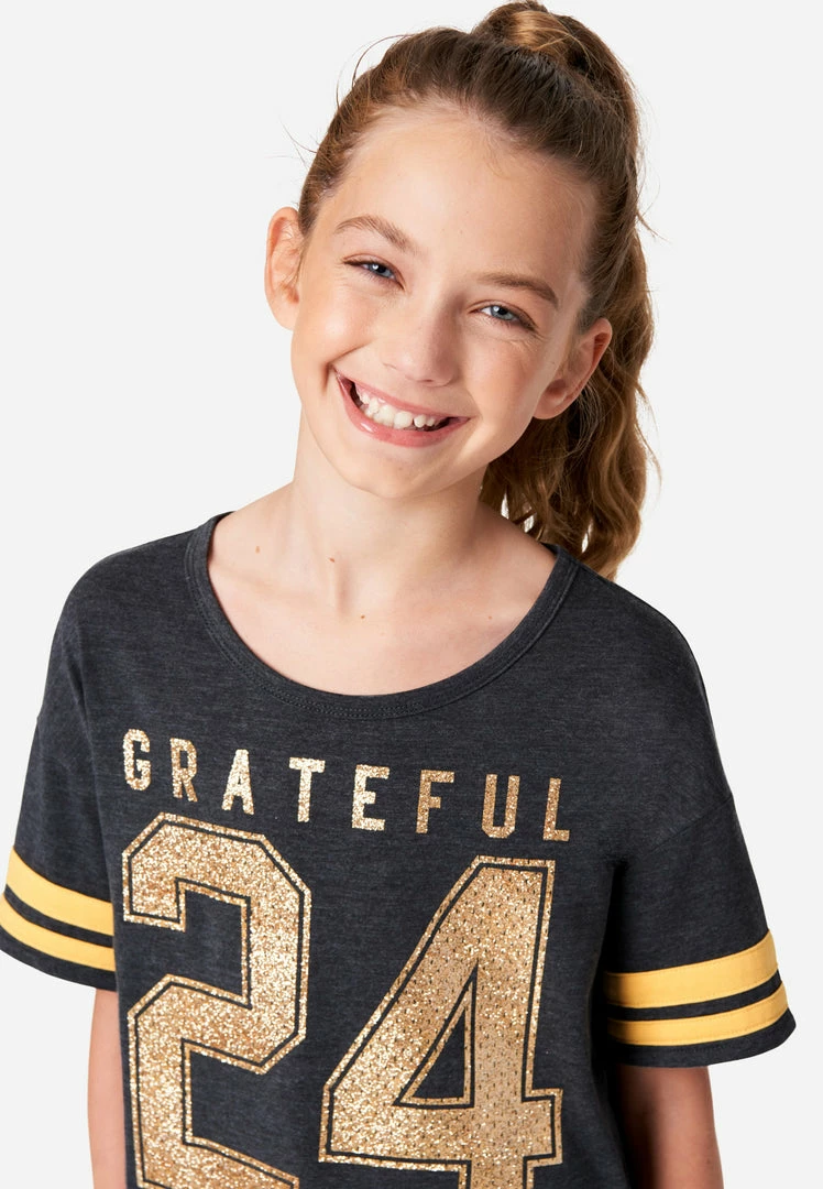 Our girls’ tees sport scoop necklines. The soft, cotton-blend fabric promises comfortable wear. Cool sports stripes pop against the bright hue. And a bold graphic punctuates the front. They’re a perfect match for Justice Denim jeans. Plus, they’re made with recycled materials. This means not only will your girl look good while wearing her fashion, but she’ll feel good about her fashion, too.Â