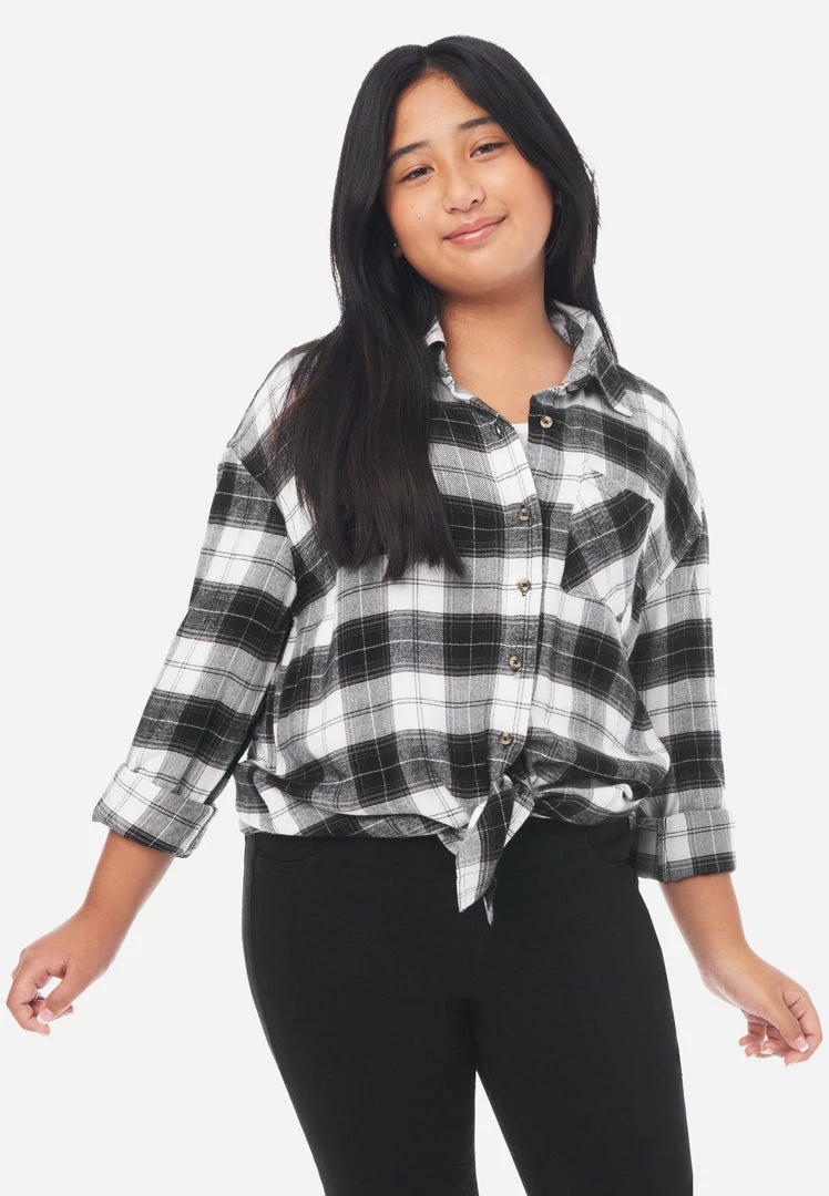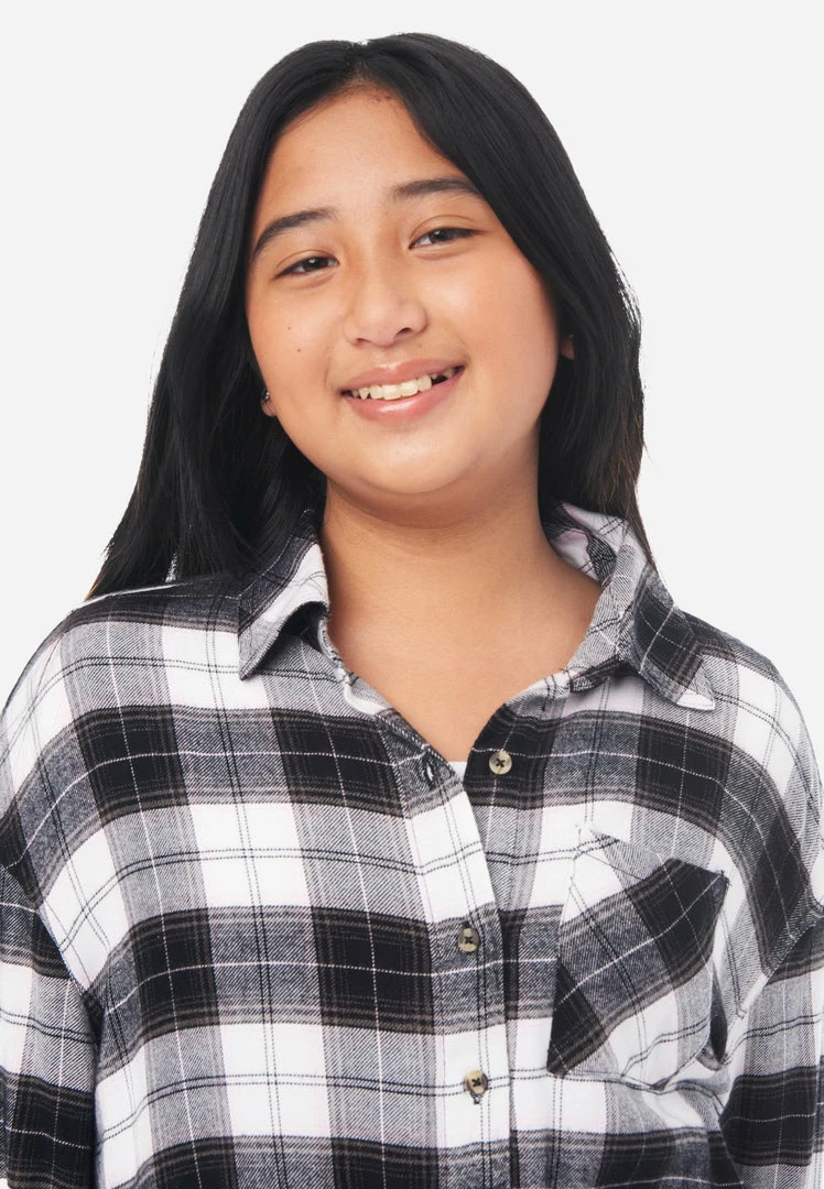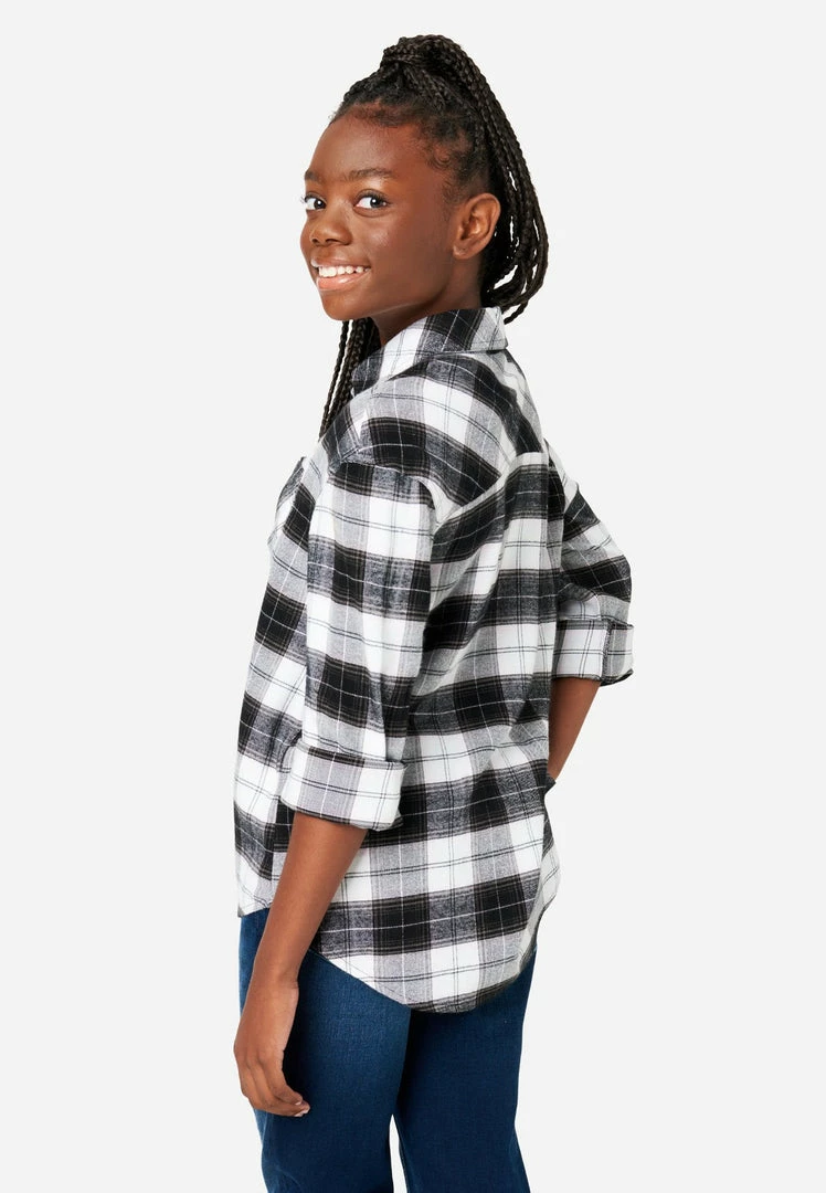 Our girls’ tops are made with lightweight, airy fabric and a relaxed cut that promise easy wear. The collar and plaid pattern lend classic style. A patch pocket highlights the front. The sleeves are ready to be styled her way—cuffed or straight. The rounded hemline makes sure these tops add structure to outfits—even when untucked. Plus, eight tortoiseshell-inspired buttons give her the option to style them buttoned up or layered over a tee. Make it an outfit with Justice Denim jeans.