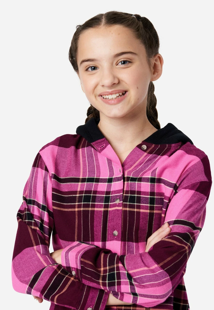 Our girls’ plaid shirt crafted from soft woven cotton will be a go-to style when she needs a little extra warmth to go with her cool look. It features a cozy faux sherpa-lined hood to fight the chill that’s complete with button-front closures and button cuffs. Perfect for layering, make it an outfit with Justice Denim jeans.